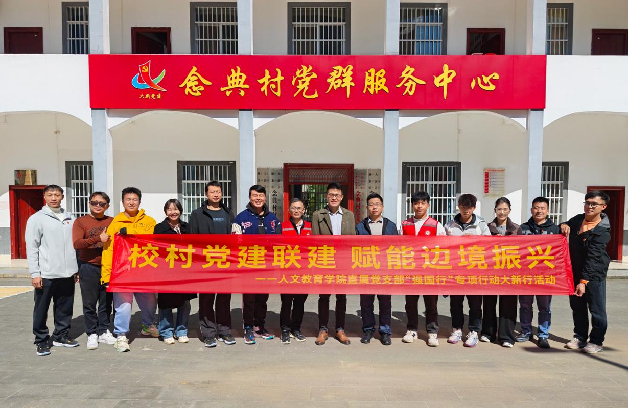 为进一步加强党员爱国主义教育,以高质量党建引领校村协同发展,助力边境乡村振兴,11月20日,人文教育学院直属党支部“强国行”专项行动团队前往崇左市大新县硕龙镇念典村,开展系列党建活动,并与念典村党总支部举行结对共建签约仪式。人文教育学院直属党支部书记张海涛、机关第七党支部书记冯婧...