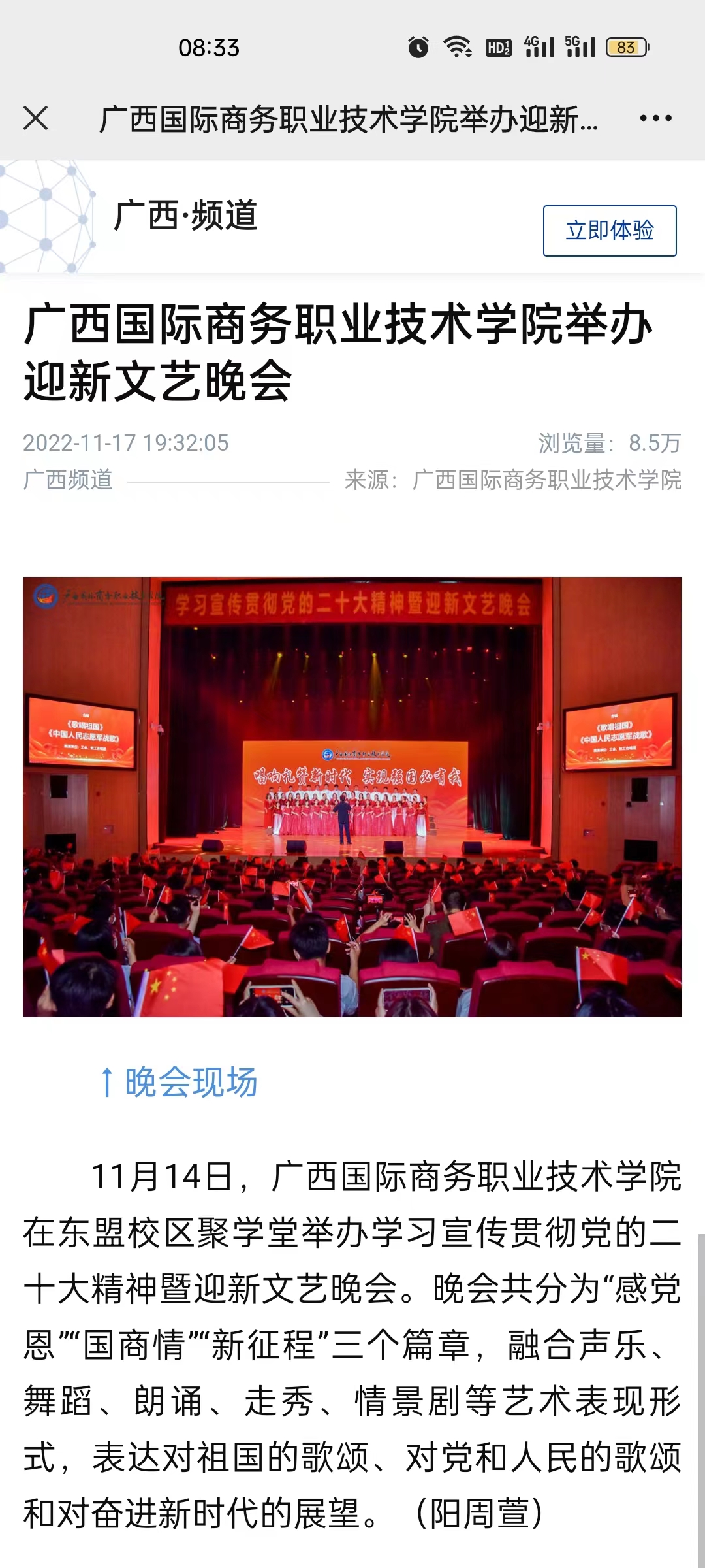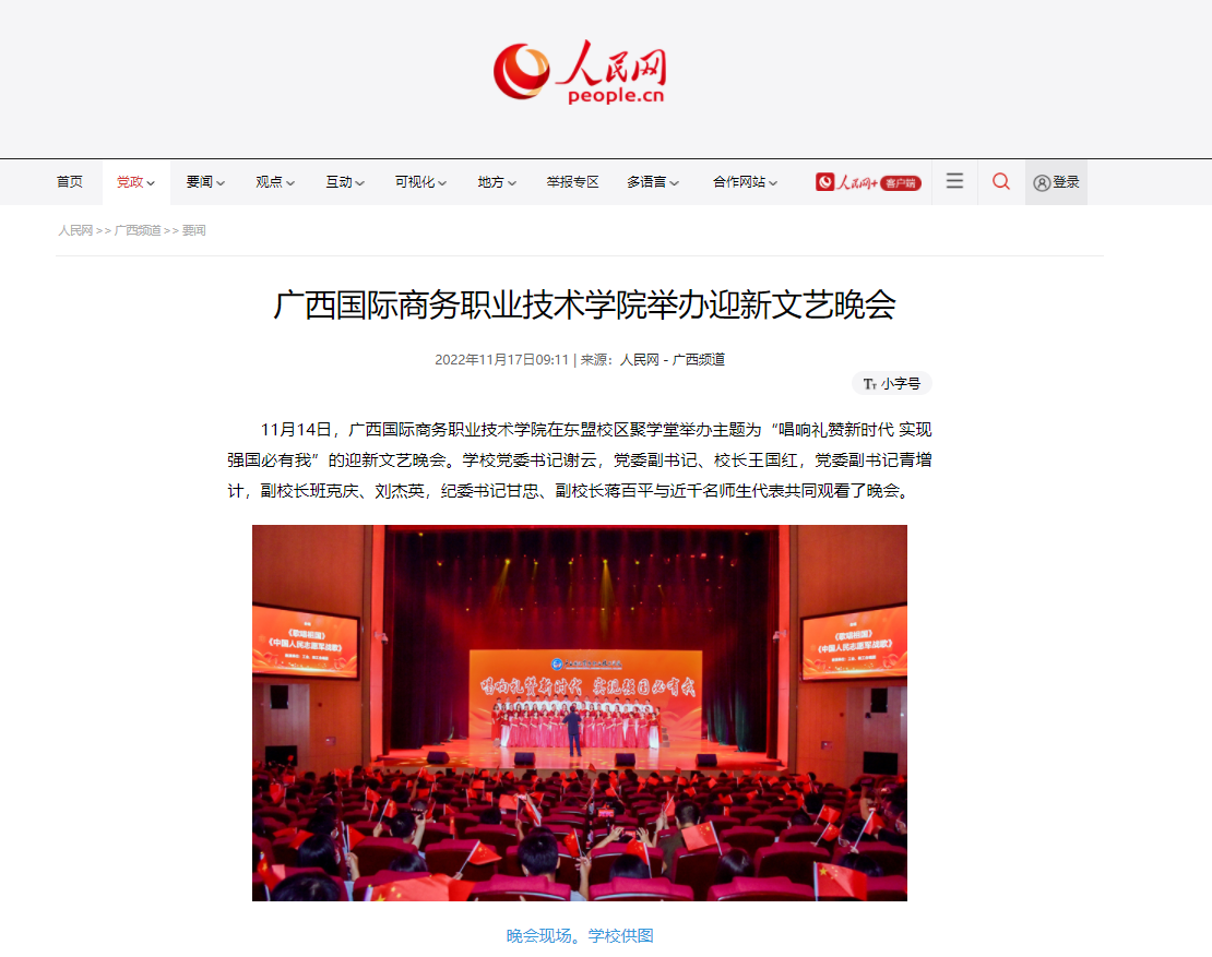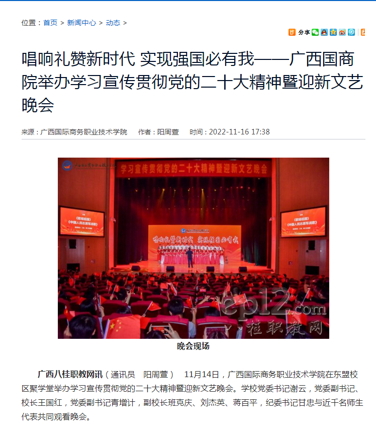 广西广播电视台新闻频道、新华社、人民网、广西八桂职教网报道我校举办学习宣传贯彻党的二十大精神暨迎新文艺晚会