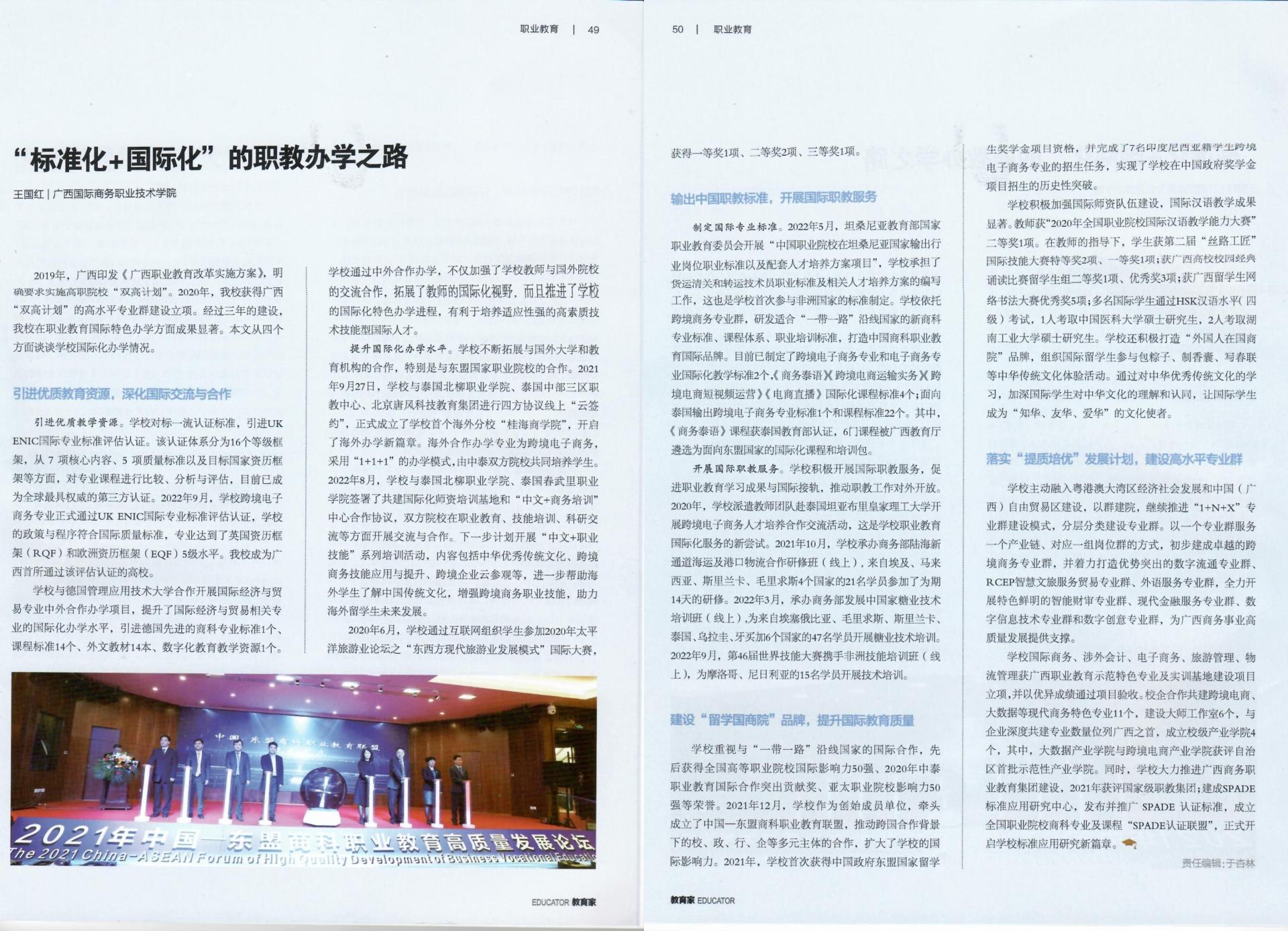 《教育家》杂志2023年1月刊第五期报道我校“标准化+国际化”的职教办学之路文章。
