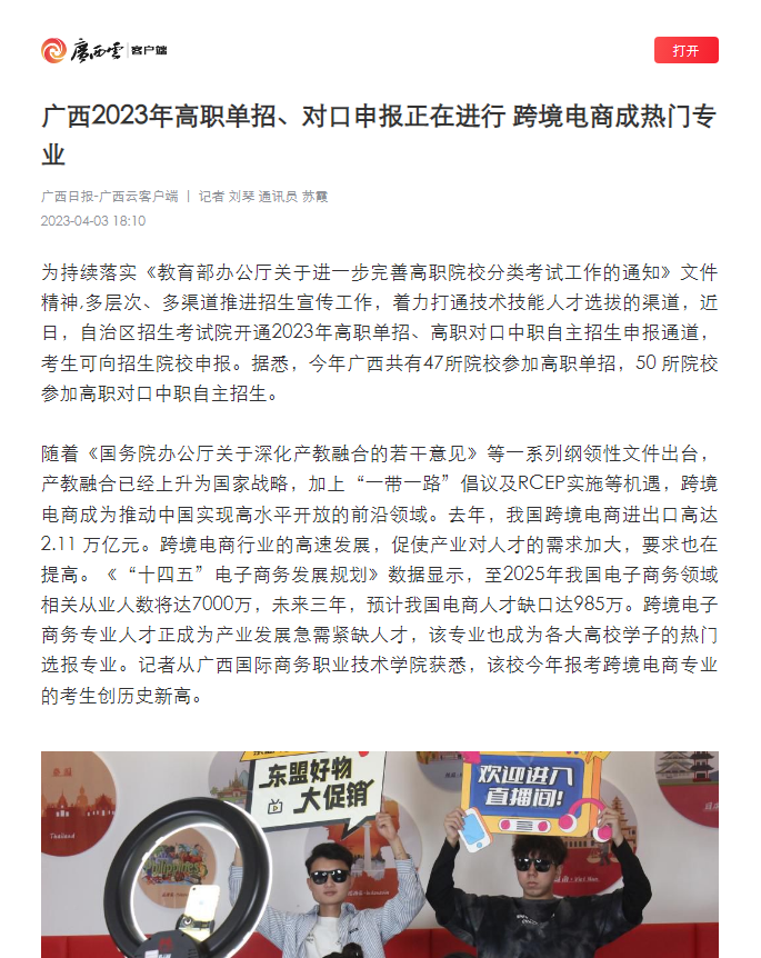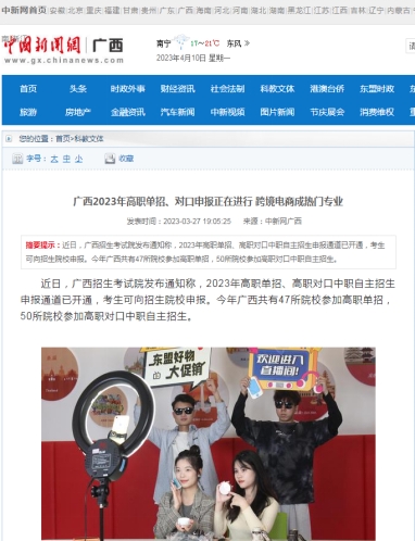 人民网、中国新闻网、广西八桂职教网、广西日报报到我校跨境电子商务专业成为广西2023年高职单招、对口申报热门专业。