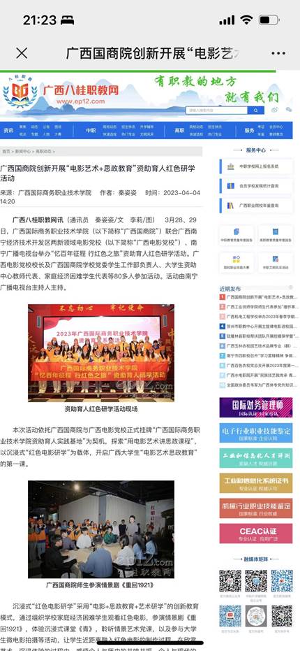 广西广播电视台新闻频道、南宁广播电视台、新华社、人民网、广西八桂职教网、中国青年报、央广网、广西日报、南宁晚报今日头条等媒体报道我校创新开展“电影艺术+思政教育”资助育人研学活动。