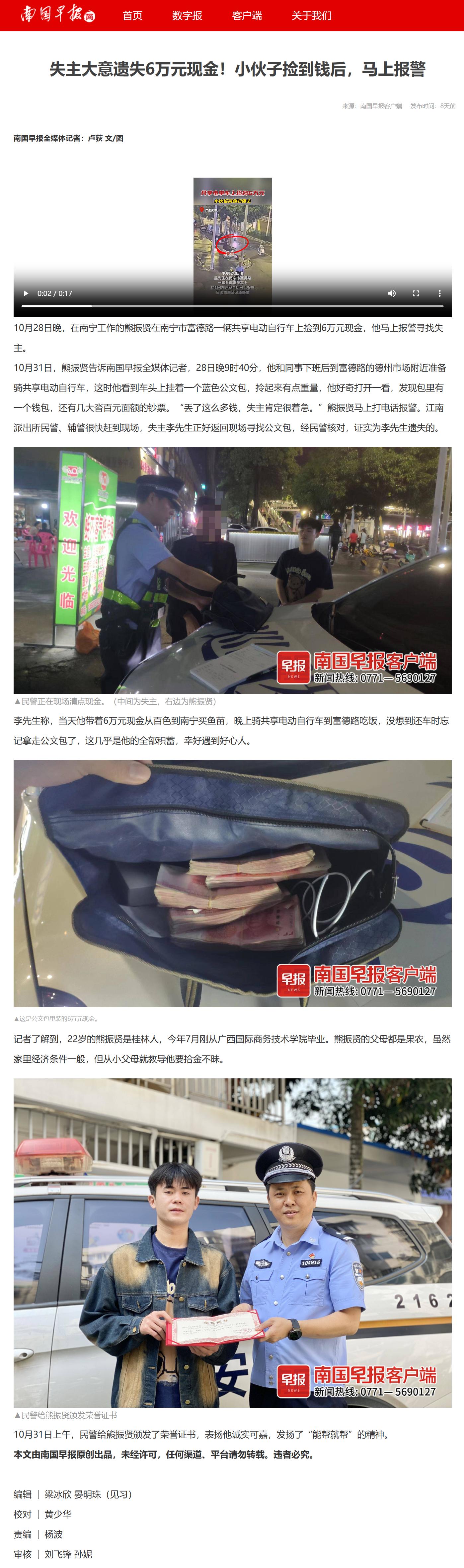 【南国早报】我校2023届物流管理专业毕业生熊振贤捡到6万元现金后,马上报警、物归原主