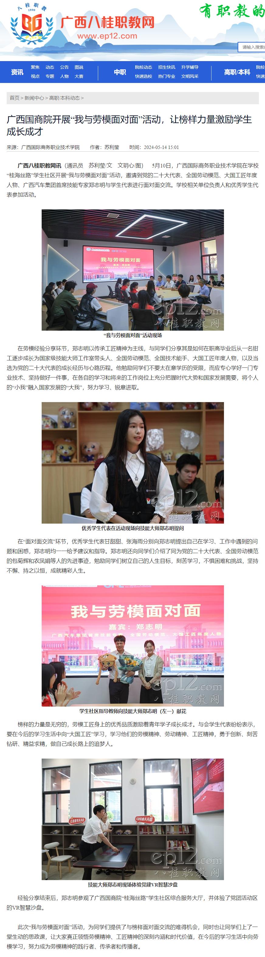 【广西八桂职教网】广西国商院开展“我与劳模面对面”活动,让榜样力量激励学生成长成才
