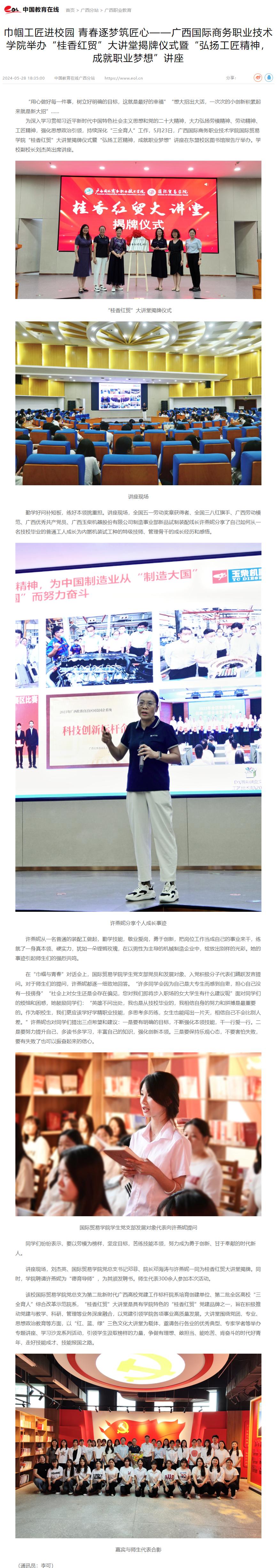 【中国教育在线】巾帼工匠进校园 青春逐梦筑匠心——广西国际商务职业技术学院举办“桂香红贸”大讲堂揭牌仪式暨“弘扬工匠精神,成就职业梦想”讲座