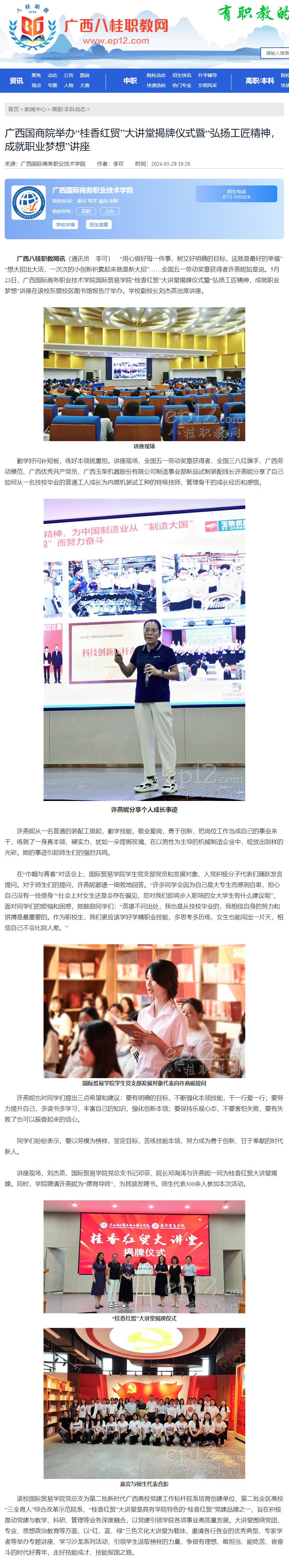 【广西八桂职教网】广西国商院举办“桂香红贸”大讲堂揭牌仪式暨“弘扬工匠精神,成就职业梦想”讲座