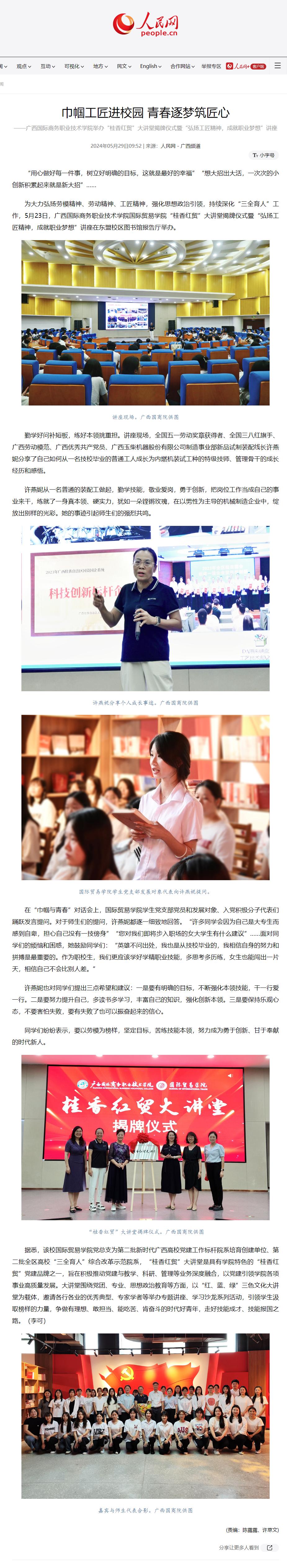 【人民网】巾帼工匠进校园 青春逐梦筑匠心——广西国际商务职业技术学院举办“桂香红贸”大讲堂揭牌仪式暨“弘扬工匠精神,成就职业梦想”讲座