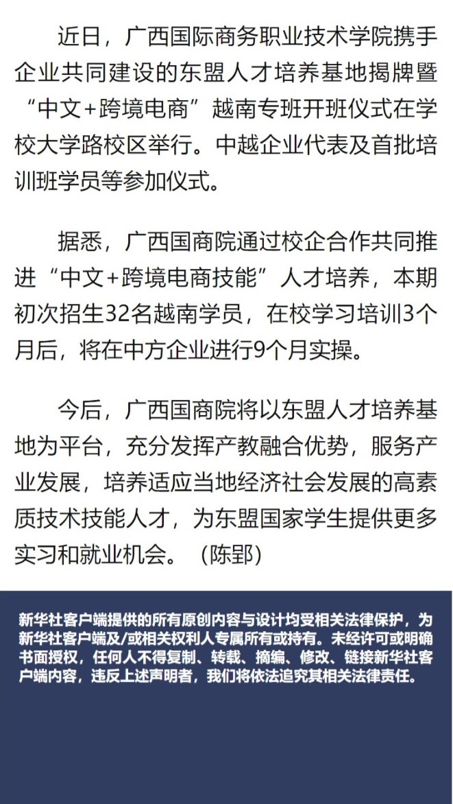 【新华社】东盟人才培养基地在广西国商院揭牌
