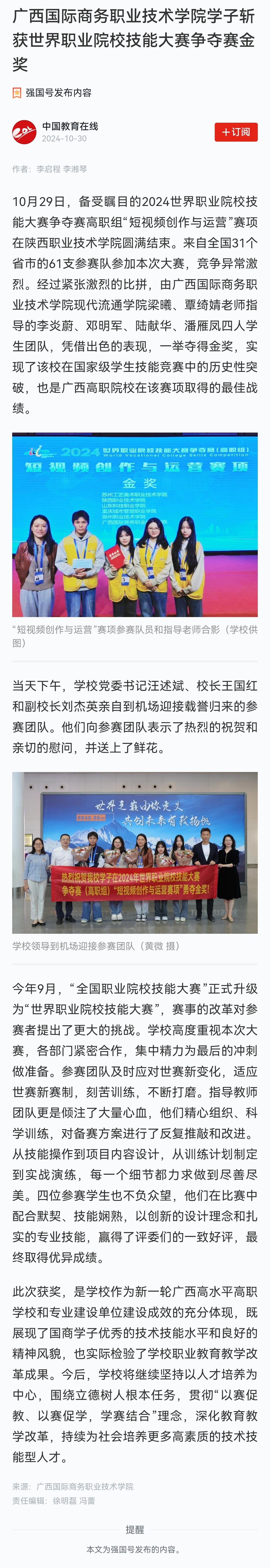 【学习强国】广西国际商务职业技术学院学子斩获世界职业院校技能大赛争夺赛金奖