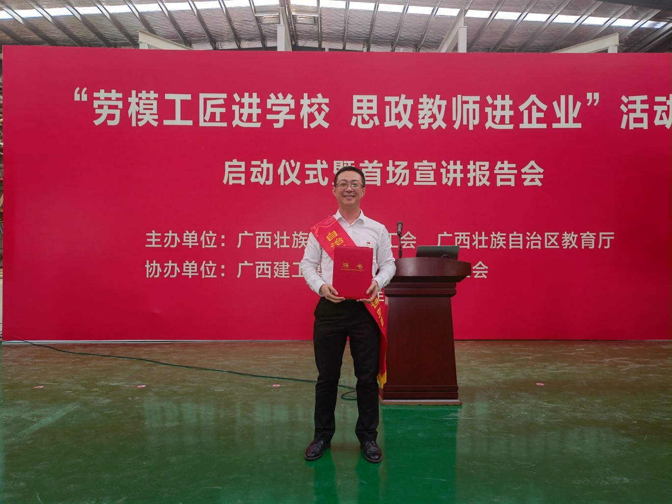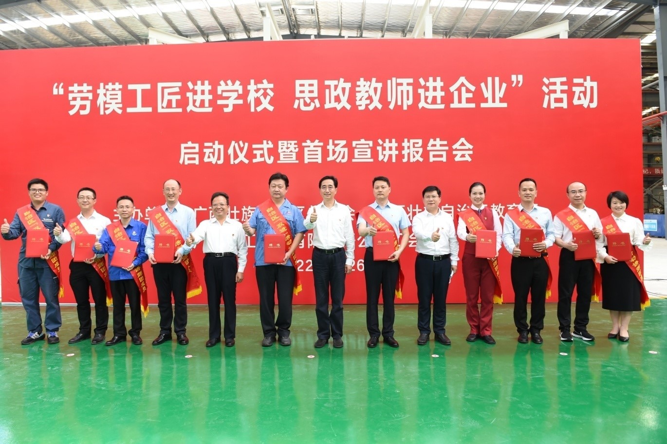 5月26日,由自治区总工会、自治区教育厅共同主办的“劳模工匠进学校思政教师进企业”(以下简称“双进”)活动启动仪式暨首场宣讲报告会在广西建工集团建筑机械制造有限责任公司生产车间举行。我校马克思主义学院院长梁芷铭教授入选“双进”活动讲师团成员并受邀作为代表参加启动仪式。