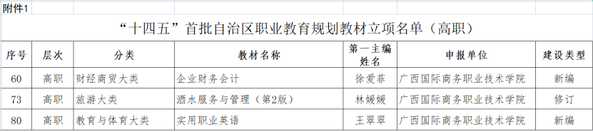 近日,在广西壮族自治区教育厅《关于公布“十四五”首批自治区职业教育规划教材立项名单的通知》中,我校作为自治区“双高计划”建设单位,共有徐爱菲教师团队新编的《企业财务会计》、林媛媛教师团队修订的《酒水服务与管理(第2版)》、王翠翠教师团队新编的《实用职业英语》等3门教材获“十四五”首批自治区职业教育规划教材立项。