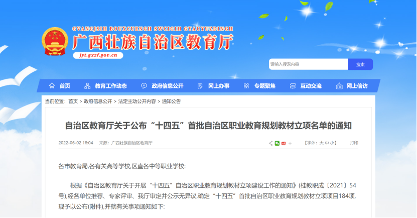 此次教材评审工作由自治区教育厅组织有关专家召开评审会对申报的各类教材进行评审,共评出十四五”首批自治区职业教育规划教材立项项目184项,其中高职组100项,中职组84项。首批遴选、立项建设的自治区职业教育规划教材建设期为2022—2023年。