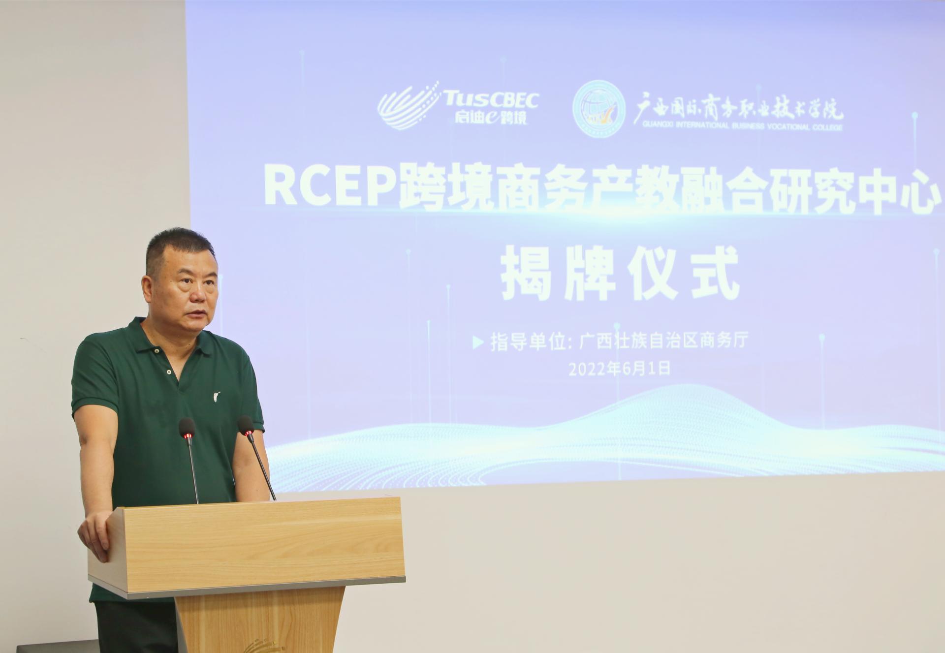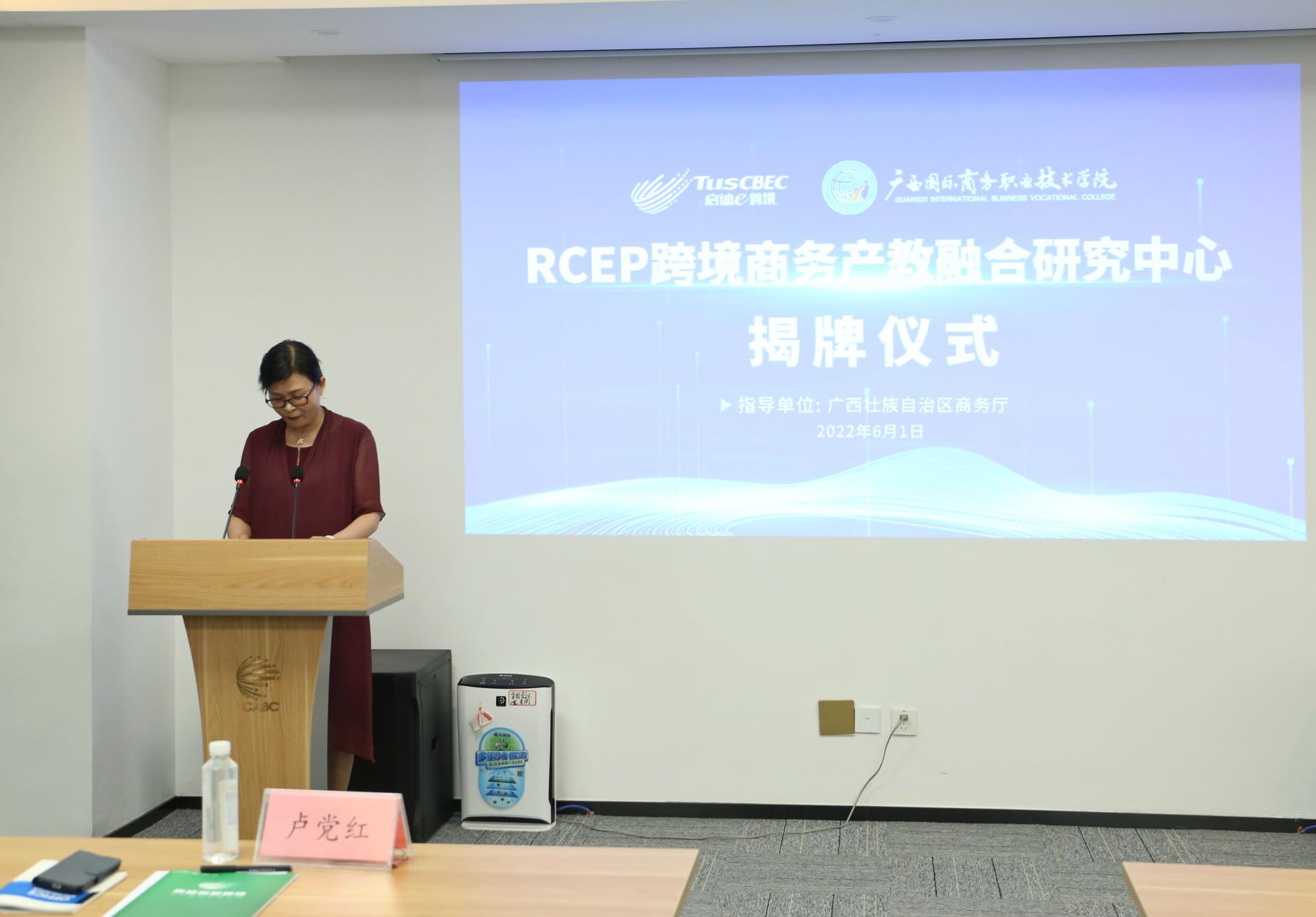 为助力RCEP协定应用实施,不断深化“产教融合,创新发展”的战略性目标,培养内外贸一体化的RECP跨境电商人才,6月1日上午,我校与广西启迪创新跨境电子商务有限公司合作的RCEP跨境商务产教融合研究中心在中国—东盟经贸中心正式揭牌成立。自治区商务厅加工贸易和服务贸易处处长卢党红,我校校长王国红,广西启迪创新跨境电子商务有限公司董事长宋铁农,我校副校长刘杰英共同揭牌。学校组织部(人事处)处长莫秋树、国际贸易学院党总支书记邓菲、国际贸易学院院长邓海涛、国际交流学院院长刘丽欢共同出席会议。会议由刘杰英主持。