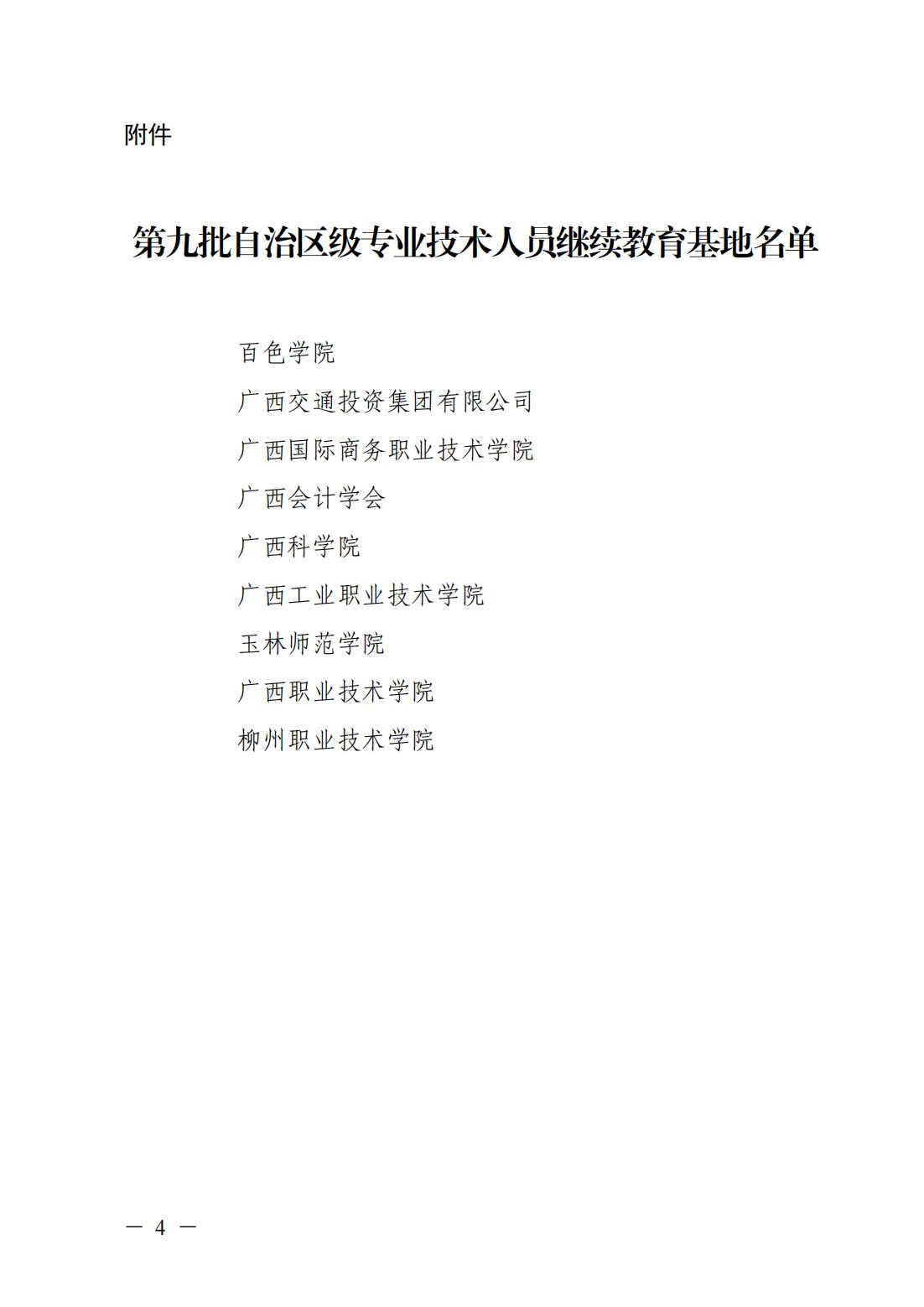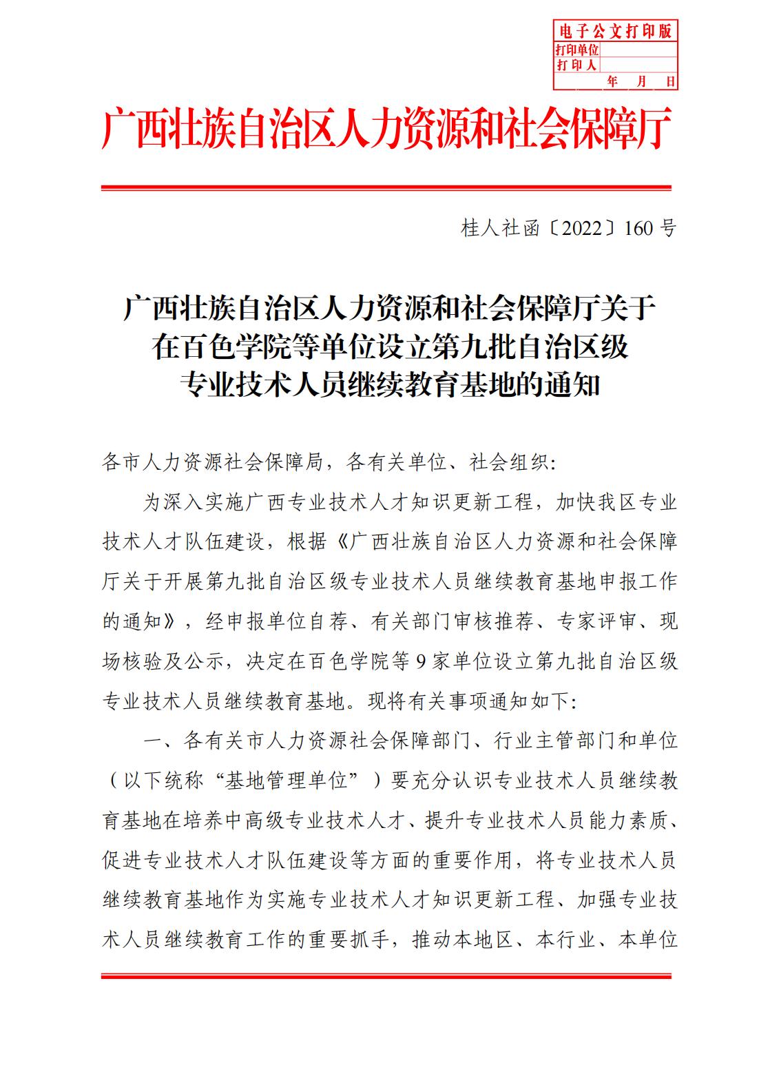 近日,自治区人力资源和社会保障厅发布《广西壮族自治区人力资源和社会保障厅关于在百色学院等单位设立第九批自治区级专业技术人员继续教育基地的通知》(桂人社函〔2022〕160号),我校获准成为自治区级第九批专业技术人员继续教育基地的9家单位之一。