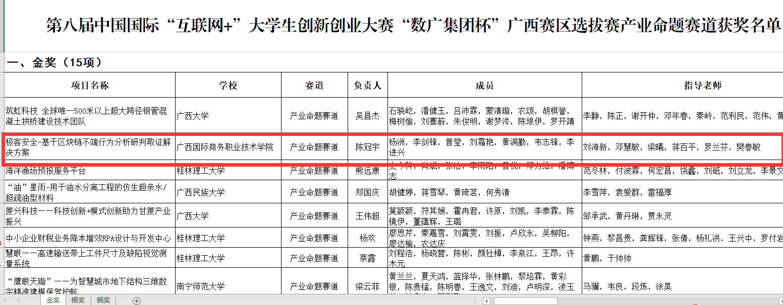 今年5月至7月,自治区教育厅等多个部门联合举办了第八届中国国际“互联网+”大学生创新创业大赛“数广集团杯”广西赛区选拔赛(以下简称区赛),全区共有110所学校、15.6万个项目、38.1万名学生参赛。经过激烈角逐,我校选送的11个项目获得金奖1项,铜奖10项的好成绩。其中,2017级计算机网络专业学生陈冠宇的创业项目《极客安全-基于区块链不端行为分析研判取证方案》以赛道第二名的成绩,荣获产业命题赛道金奖,并作为广西高职院校唯一代表参加“互联网+”全国总决赛产业命题赛道的比赛,也是我校创业项目连续第4年入围“互联网+”全国总决赛。
