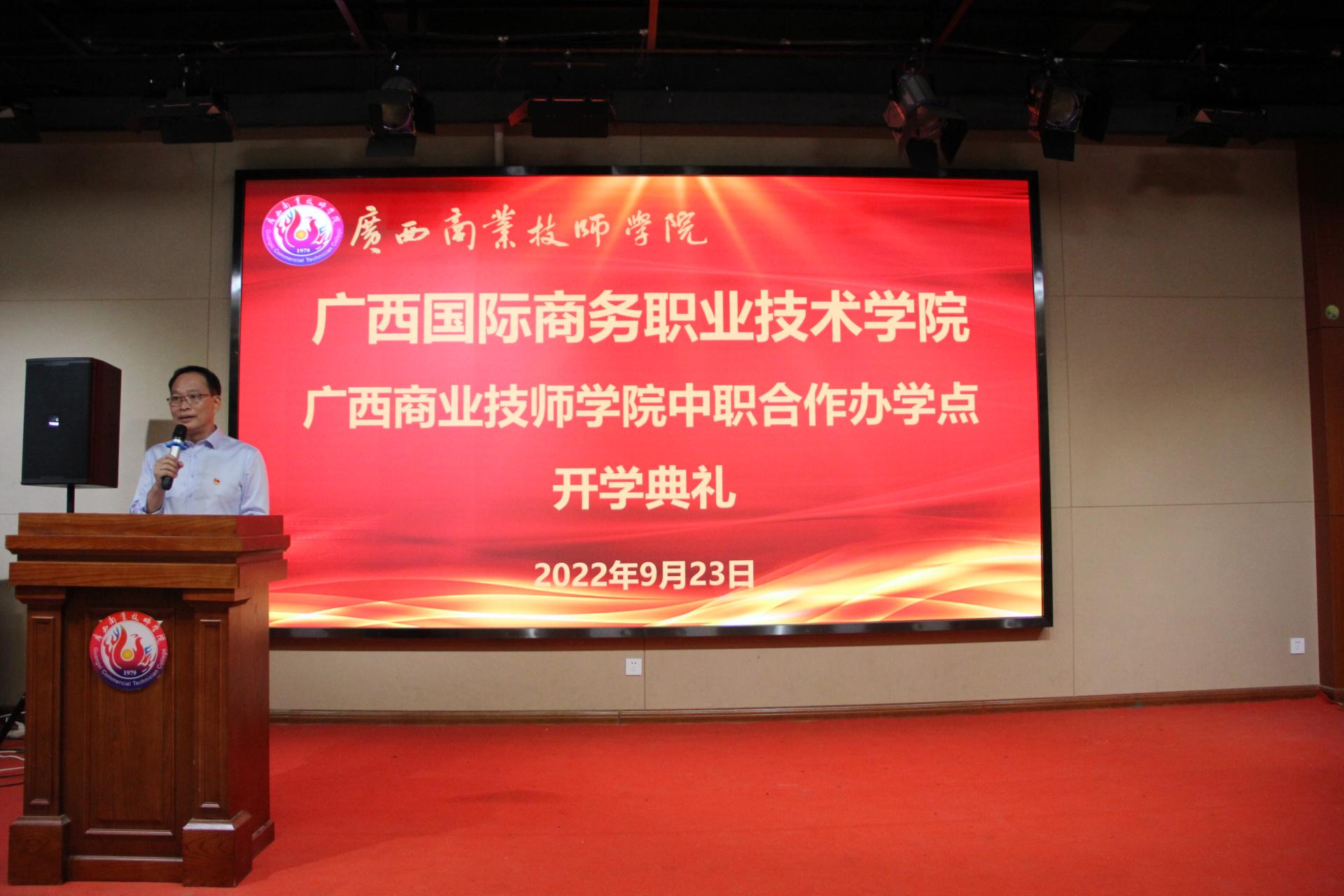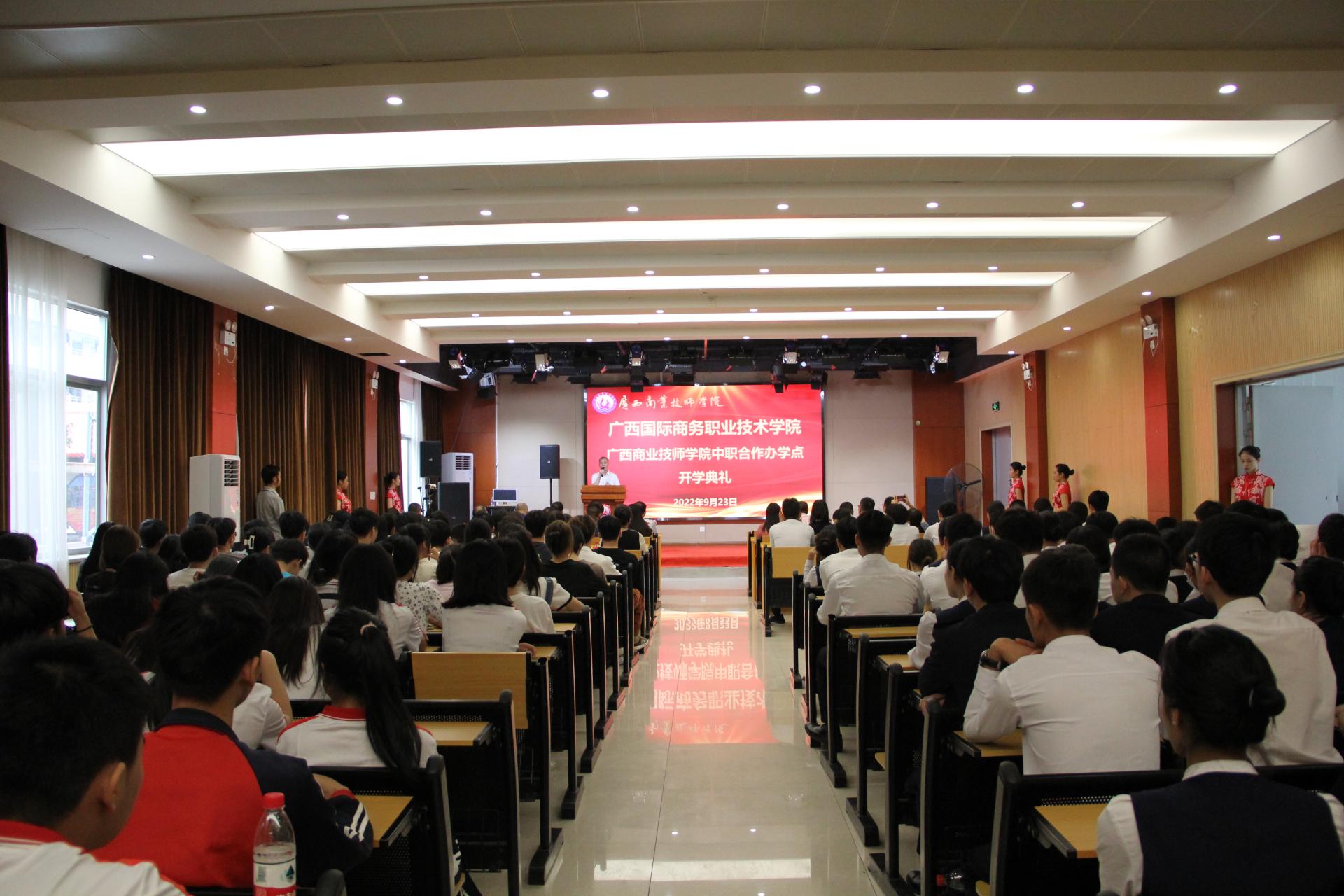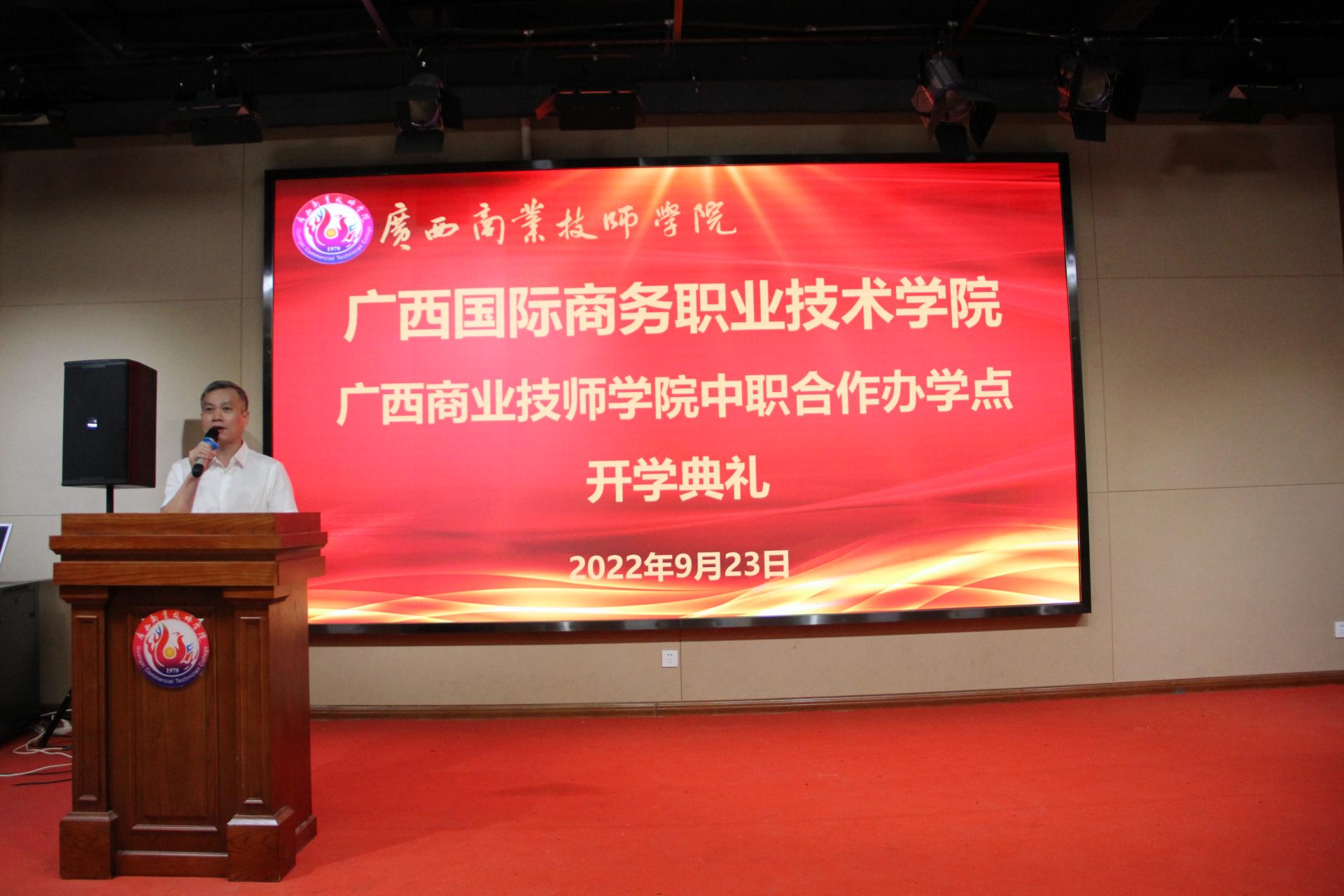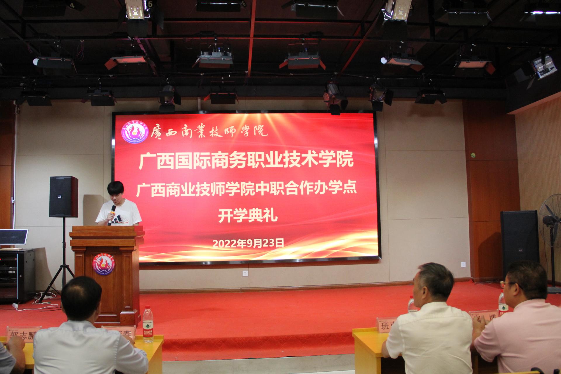 九月灼灼其华,有莘莘学子正奋发。9月23日,我校与广西商业技师学院联合举办的高职专业学院揭牌仪式暨开学典礼在广西商业技师学院1号楼演播大厅隆重举行。我校副校长班克庆,广西商业技师学院校长陆燕春,广西商业技师学院副校长何水荣、党委委员郭志鹏出席典礼。两校相关部门负责人、骨干教师、班主任、辅导员及高职专业学院2022级全体新生共同参加典礼。典礼由广西商业技师学院校长助理梁冠强主持。