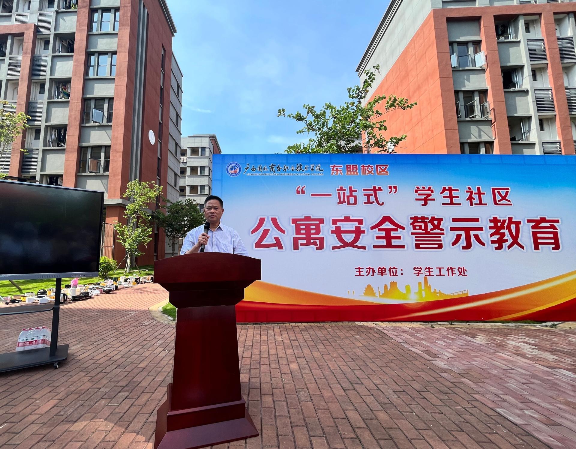 为帮助学生提高社区居住的安全防范意识,保障在校师生的人身安全和利益,6月1日下午,学校在东盟校区“一站式”学生社区举办安全警示教育系列活动启动仪式。学校党委副书记青增计出席启动仪式。党委学生工作部(处)中层干部和三层机构负责人代表,各二级学院专职副书记和辅导员代表,东盟校区物业宿管员代表及学生代表近百人参加了活动。