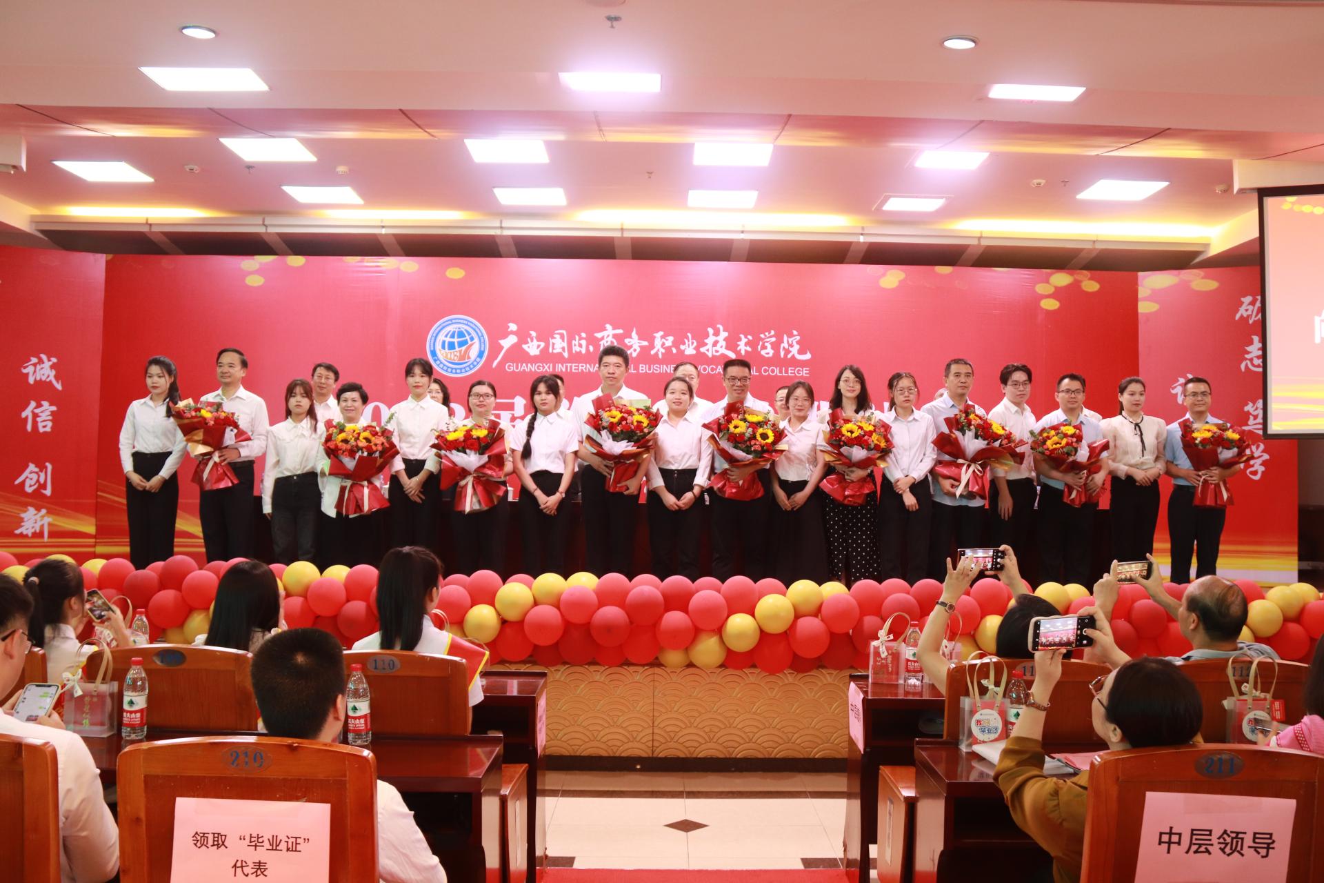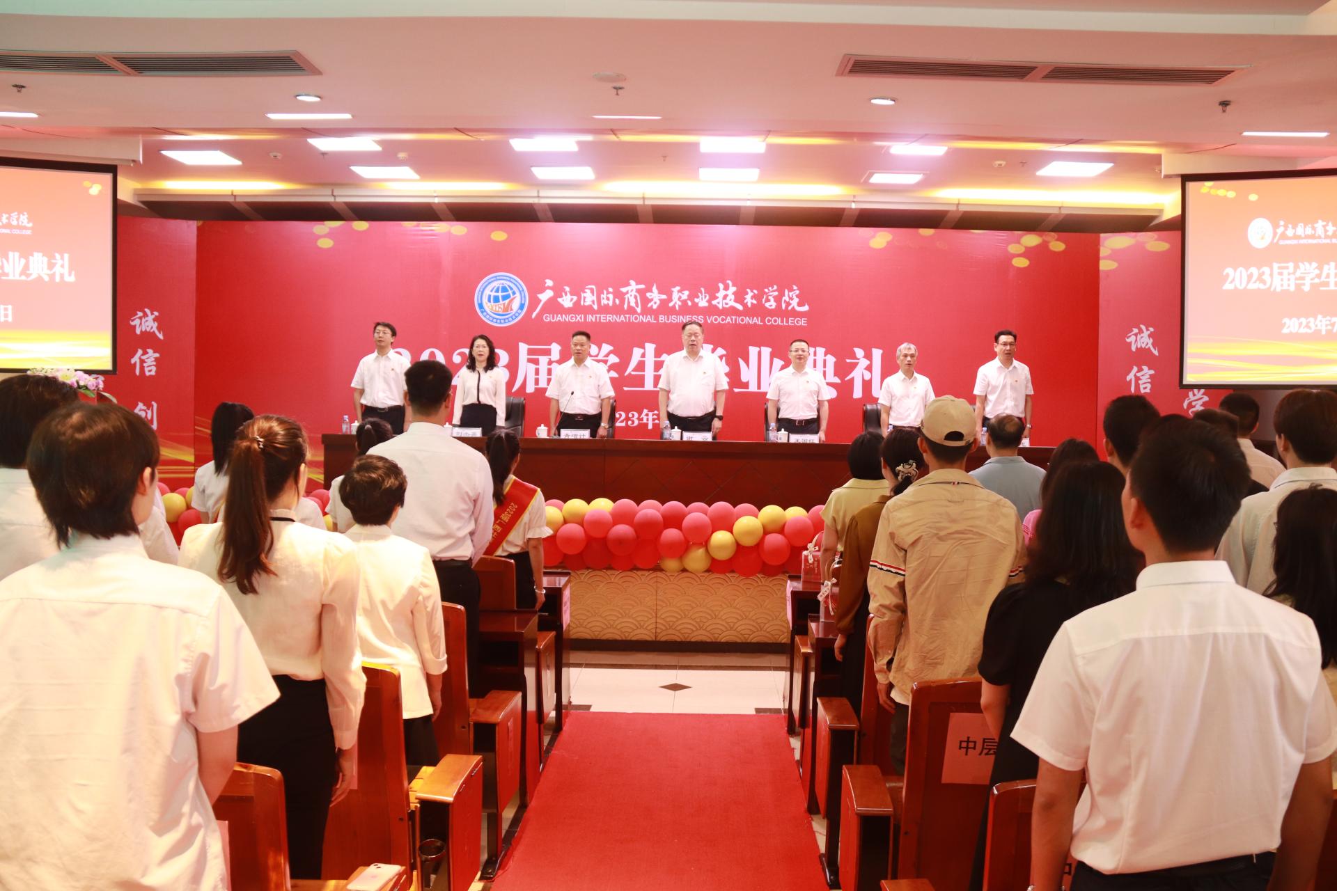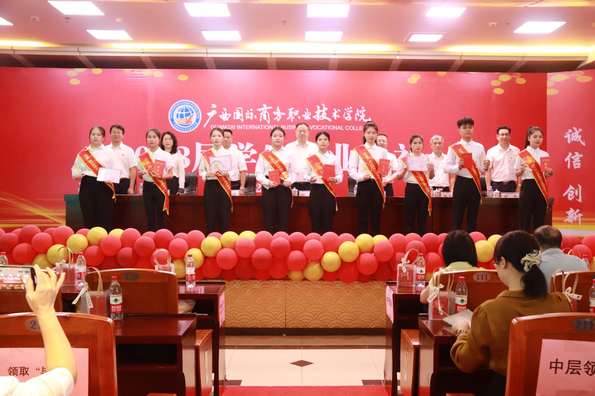在庄严的国歌声中,毕业典礼正式拉开了序幕。随后,刘杰英宣读了自治区优秀毕业生表彰文件,学校领导为自治区优秀毕业生代表颁发荣誉证书、纪念品,并为毕业生代表颁发毕业证书,祝贺我校2023届5000多名毕业生顺利毕业。