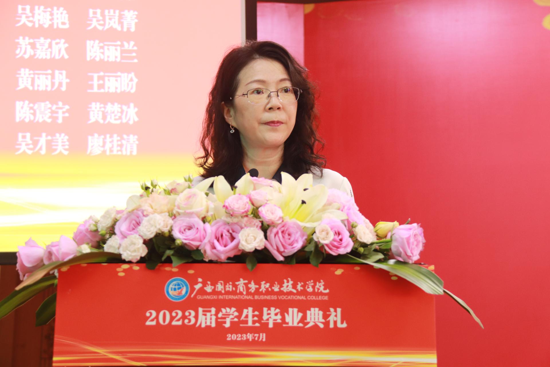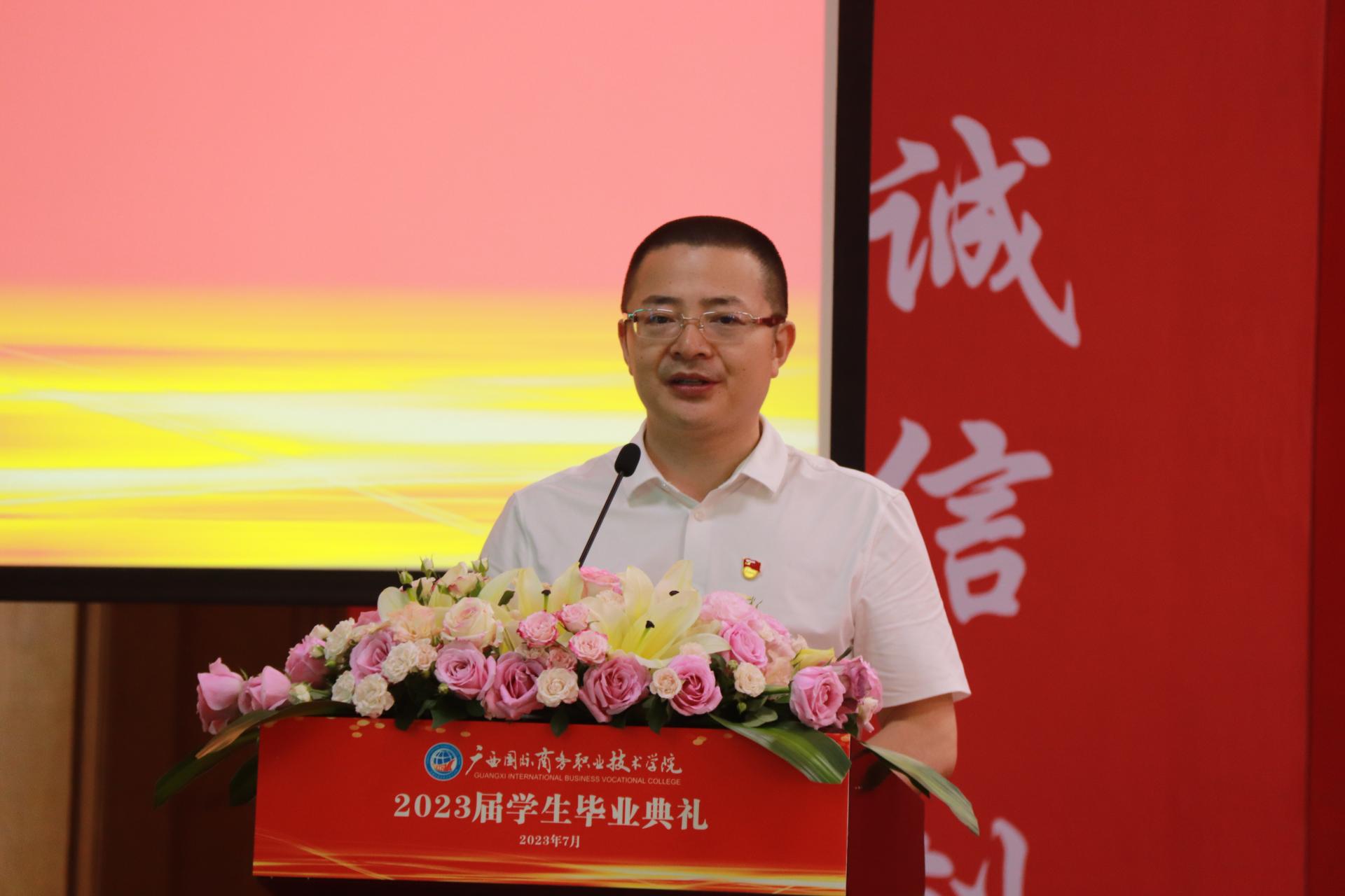 典礼最后,在热烈的掌声中,王国红以《唯有理想和本领能助你不负时代、行稳致远》为题作临别赠言,代表学校向圆满完成学业的2023届毕业生表示祝贺,向即将奔赴人生下一场际遇的毕业生提出了殷切期望并送上了诚挚祝福。王国红指出,三年前,来自五湖四海的你们加入“国商院”大家庭,将最美好的青春、最动人的韶华、最努力的付出留在了这片热土上。一路走来,你们赶上了国家和学校的一系列大事、要事、喜事,与祖国同进,与时代同行,与学校共成长!每一位毕业生都是参与者和见证者!临别之际,他对同学们提出了殷切希望:一要志存高远,争做新时代的明白人。在奉献中明白人生的价值和意义,珍惜追求的快乐和幸福,领悟奋斗的真谛和荣光。二要扎根基层,争做新时代的苦干人。学会扎扎实实从基层做起,牢记“只争朝夕,不负韶华”的嘱托期许。三要锤炼本领,争做新时代的能干人。在平凡中铸就伟大事业,在新征程上留下无悔的青春足迹。王国红最后勉励2023届毕业生,不念过往、不负当下、不畏未来,在乱云飞渡的纷扰中把准航向,在劈波斩浪的征程上砥砺前行,在历尽百舸争流、千帆竞渡的昂扬奋斗后成就精彩的人生!