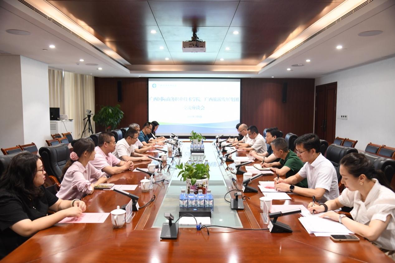7月6日校长王国红和副校长班克庆率招就处处长容博、文化与旅游学院副院长黄志康等一行7人赴广西旅游发展集团就岗位实习、就业和建立订单班进行交流洽谈。