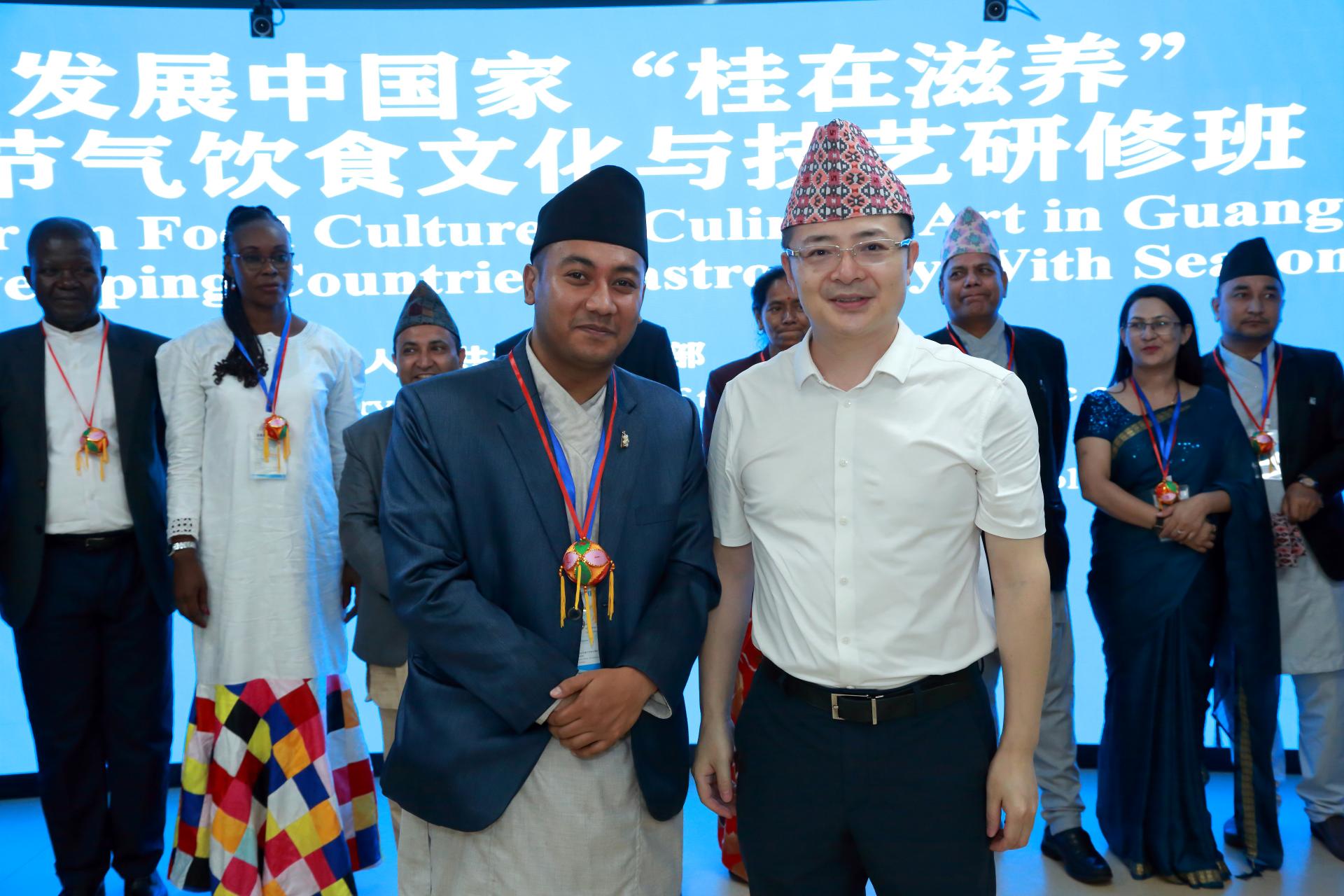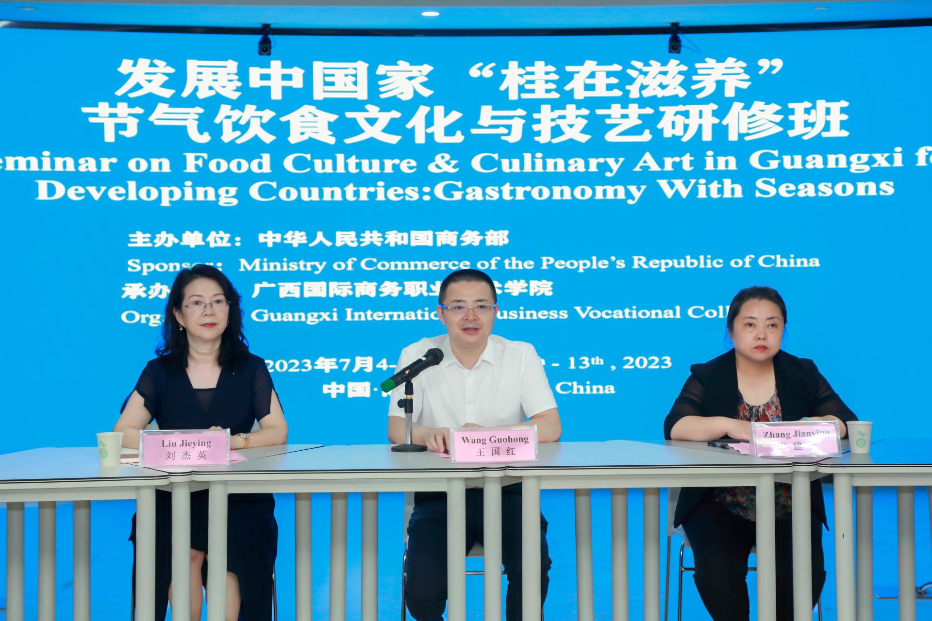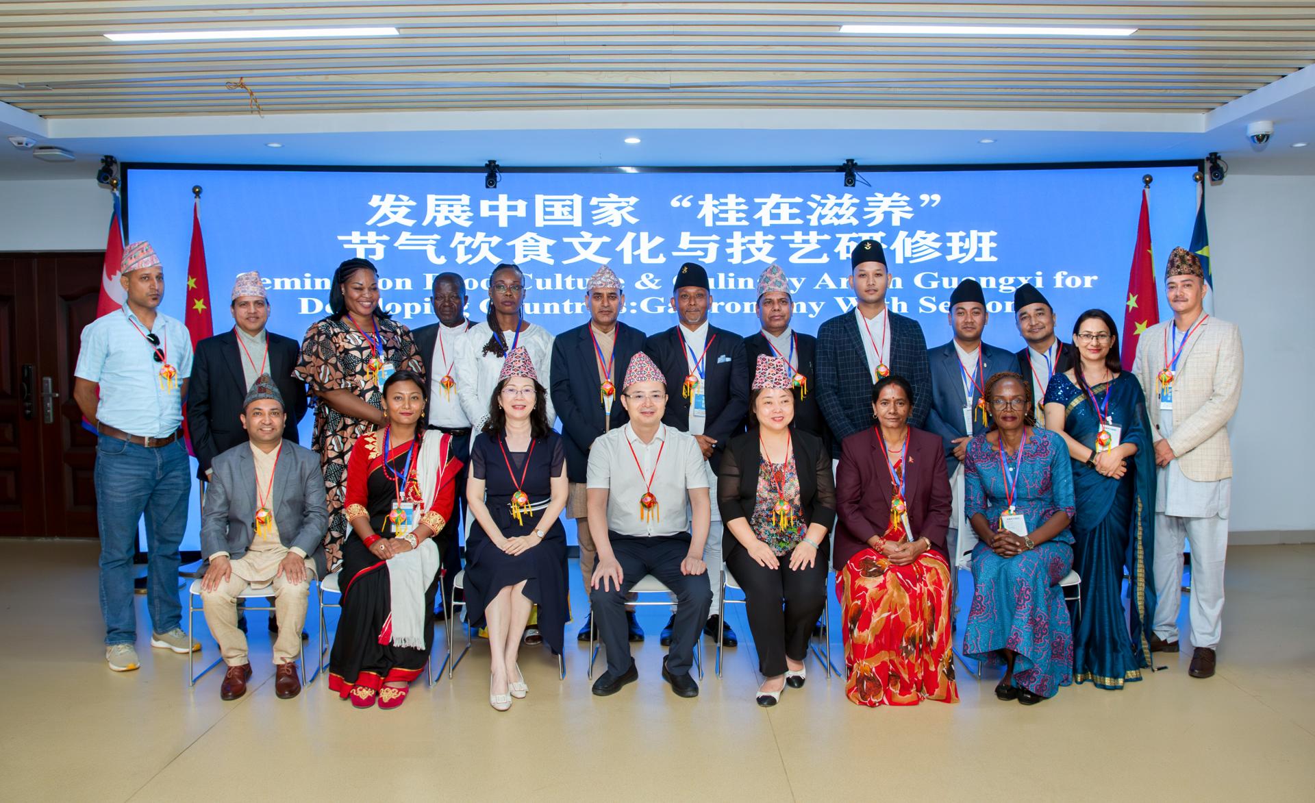 7月5日下午,由商务部主办、我校承办的“发展中国家‘桂在滋养’节气饮食文化与技艺研修班”开班仪式在我校举行,17位来自中非共和国和尼泊尔的学员参加了开班仪式。仪式由副校长刘杰英主持,自治区商务厅对外经济合作处二级调研员张建英和我校校长王国红出席仪式并致辞,来自尼泊尔的阿妮塔·马哈詹女士代表研修班学员发言。