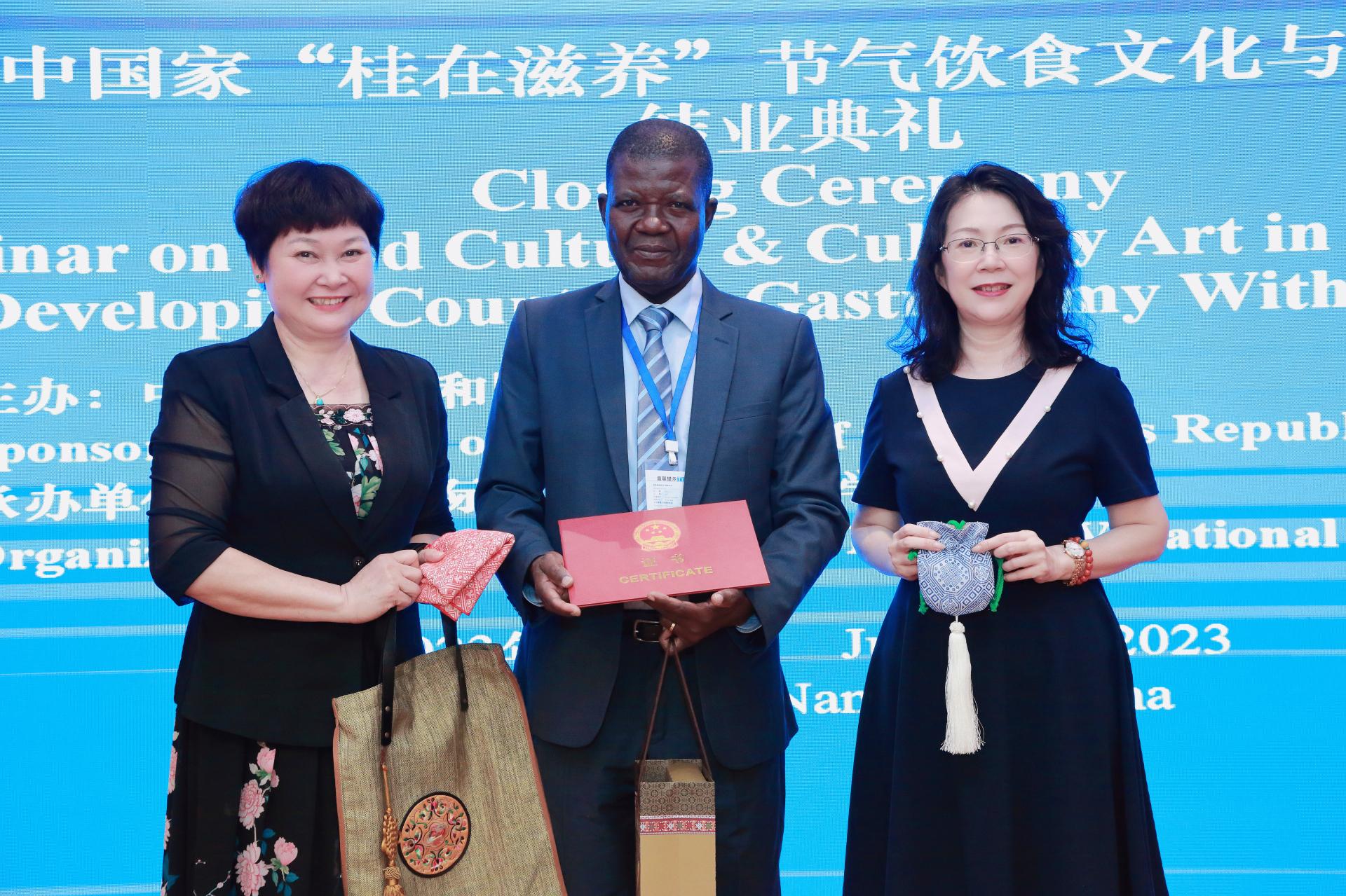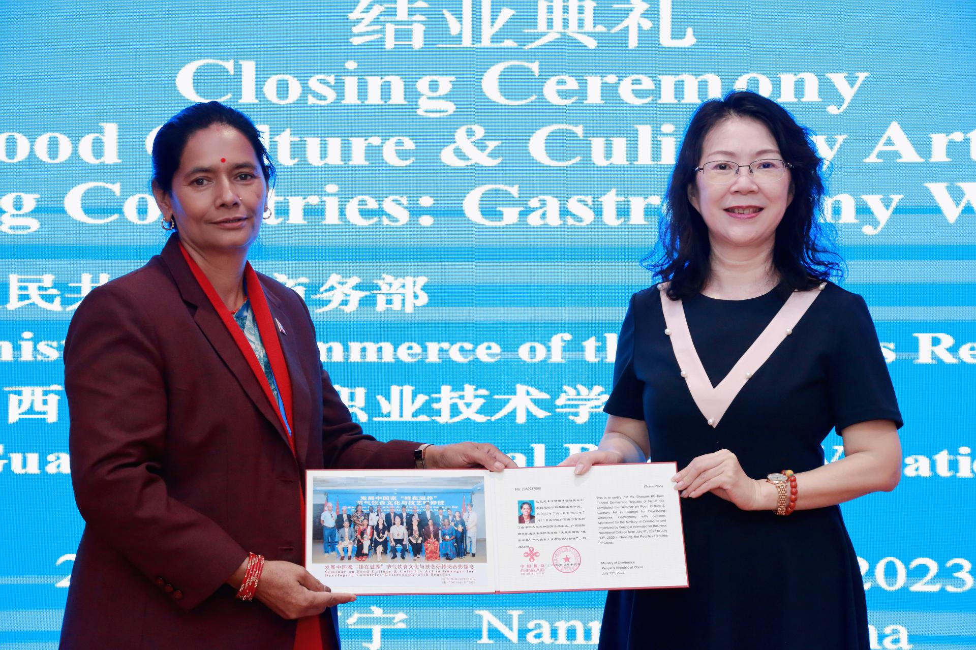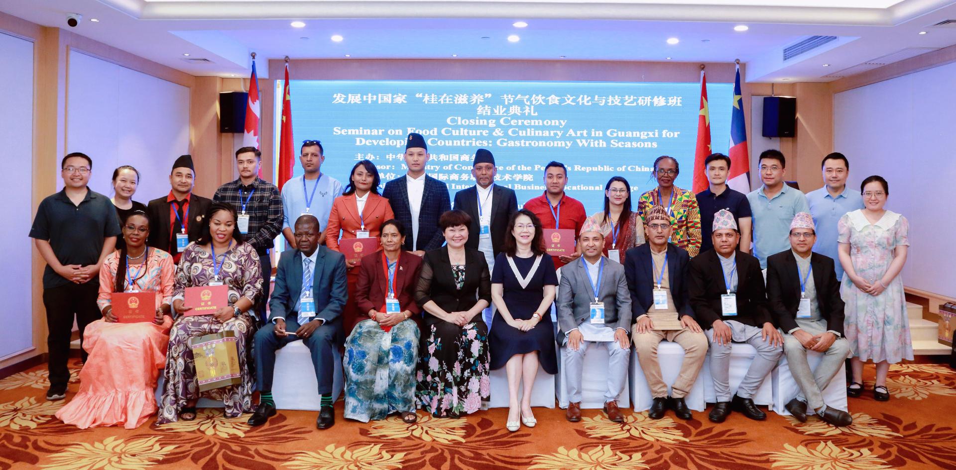 发展中国家“桂在滋养”节气饮食文化与技艺研修班结业典礼于7月13日顺利举行,来自中非共和国、尼泊尔的学员在中国度过了充实而精彩的10天,圆满完成了各项培训任务。本次研修班是我校本年度承办的第3期援外培训项目,由国家商务部主办,得到了自治区商务厅的悉心指导和广西商业技师学院的全面支持。学校副校长刘杰英出席结业典礼并为学员颁发结业证书。
