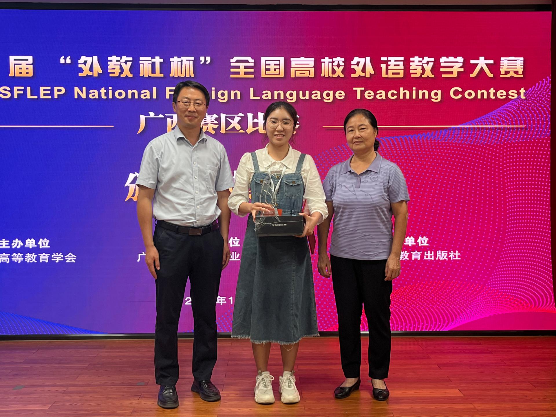 颁奖典礼上,陆燕表示,本次大赛不仅是一次比赛,更是一场交流与学习的盛会。参赛选手们不仅展现了扎实的教学技能,也传递了对外语教育的热爱和追求。希望大家能够将比赛中学到的经验与知识运用到实际教学中,为广西的外语教育事业贡献更多力量。“外教社杯”全国高校外语教学大赛规模大,层次高,影响力强,为高校搭建了沟通交流的平台,为高校教师提供了展现教学技能、展示教育风采和水平的舞台。希望参赛教师坚守立德树人初心,更新教学理念,增强英语教学能力,提升英语教学质量,提高育人水平,为建设高水平英语教师队伍作出积极的贡献。