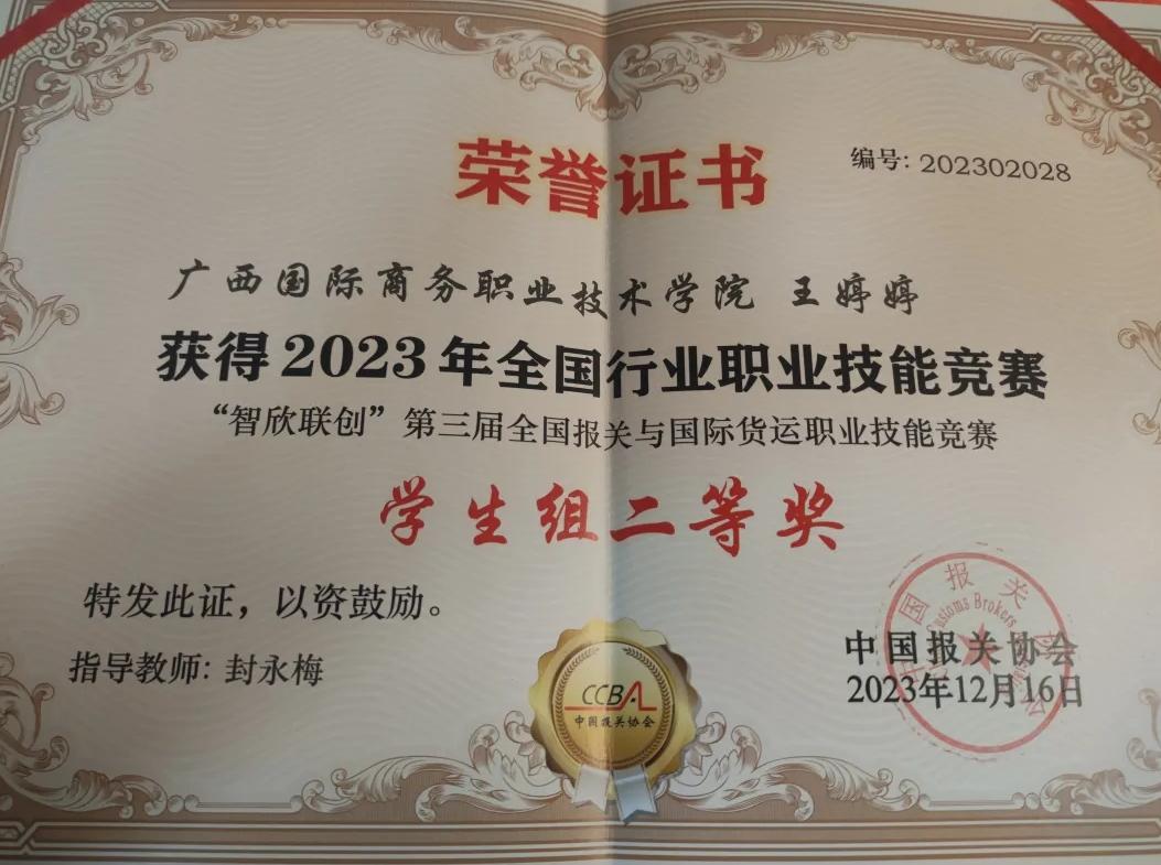12月16日,中国报关协会和中国就业培训技术指导中心主办的“2023年全国行业职业技能竞赛——第三届全国报关与国际货运职业技能竞赛”在沈阳落下帷幕。本届赛事经过资格赛、初赛、复赛的层层选拔,最终产生来自全国20多个省(区、市)的200名职工选手(广西2名)和100名学生选手(广西6名)参加全国总决赛。我校2021级关务与外贸服务专业学生王婷婷参加决赛,最终荣获学生组个人二等奖的优异成绩。