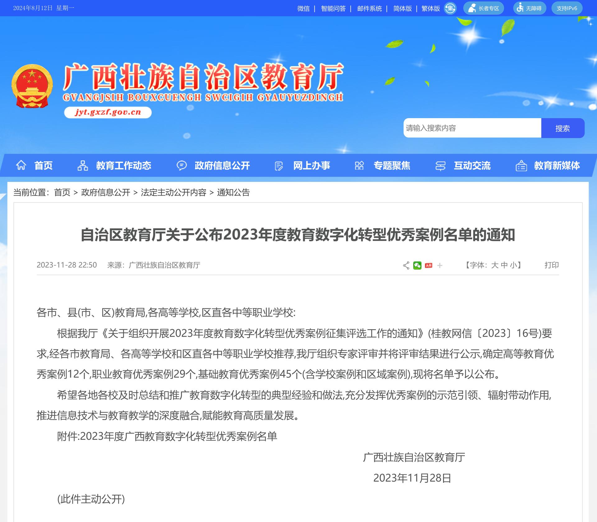 2023年度广西教育数字化转型优秀案例名单通知截图