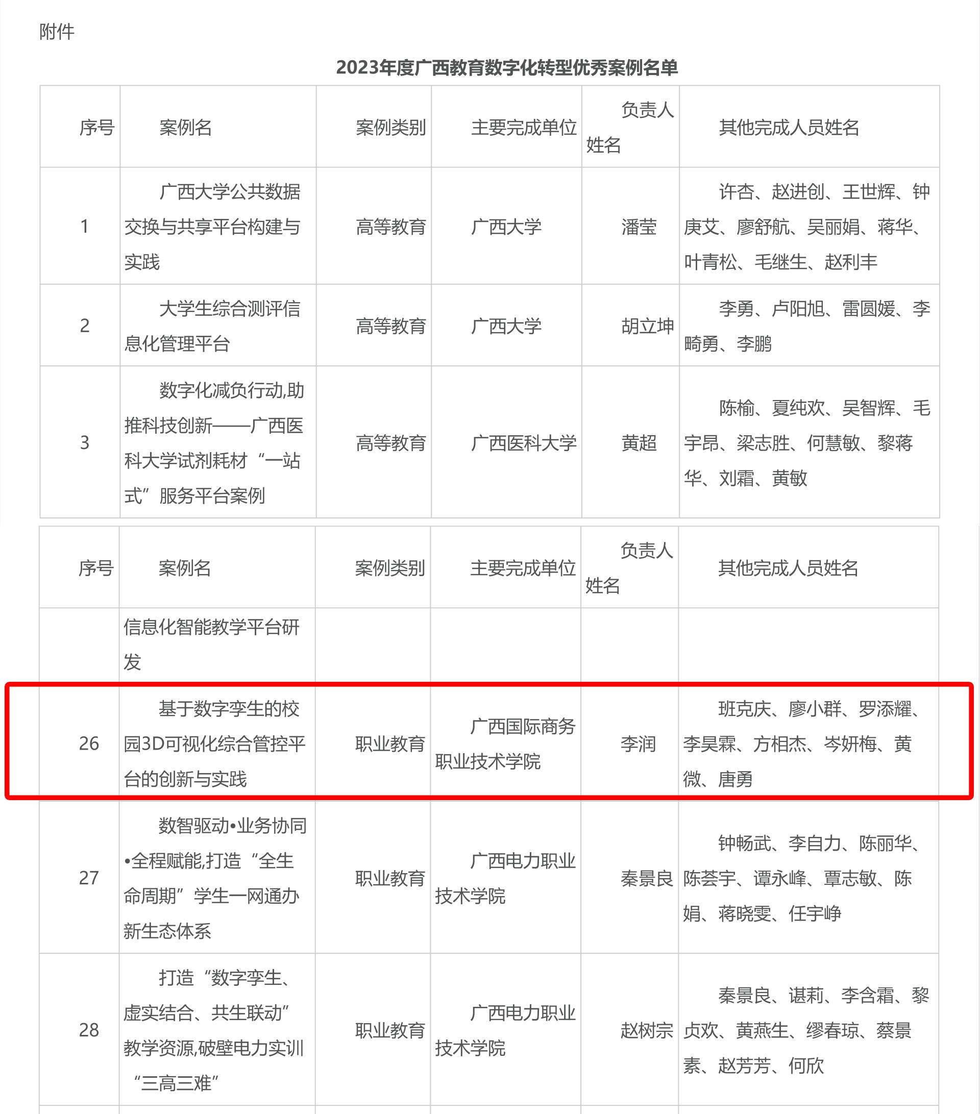 近日,自治区教育厅公布2023年度教育数字化转型优秀案例名单,由我校教育技术与信息中心组织报送的《基于数字孪生的校园3D可视化综合管控平台的创新与实践》成功入选为“2023 年度广西教育数字化转型优秀案例”。