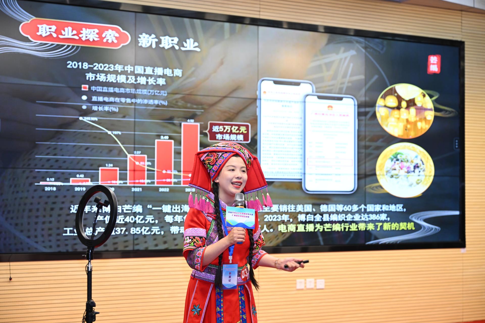 吴宇清以“讲芒编 我很牛”为主题陈述,以芒编带货主播为求职岗位,围绕求职岗位需求展示个人胜任能力。她希望通过直播带货,将非遗芒编的魅力展现给更多人,让这项传统手艺在现代社会焕发新生,继续传承下去。