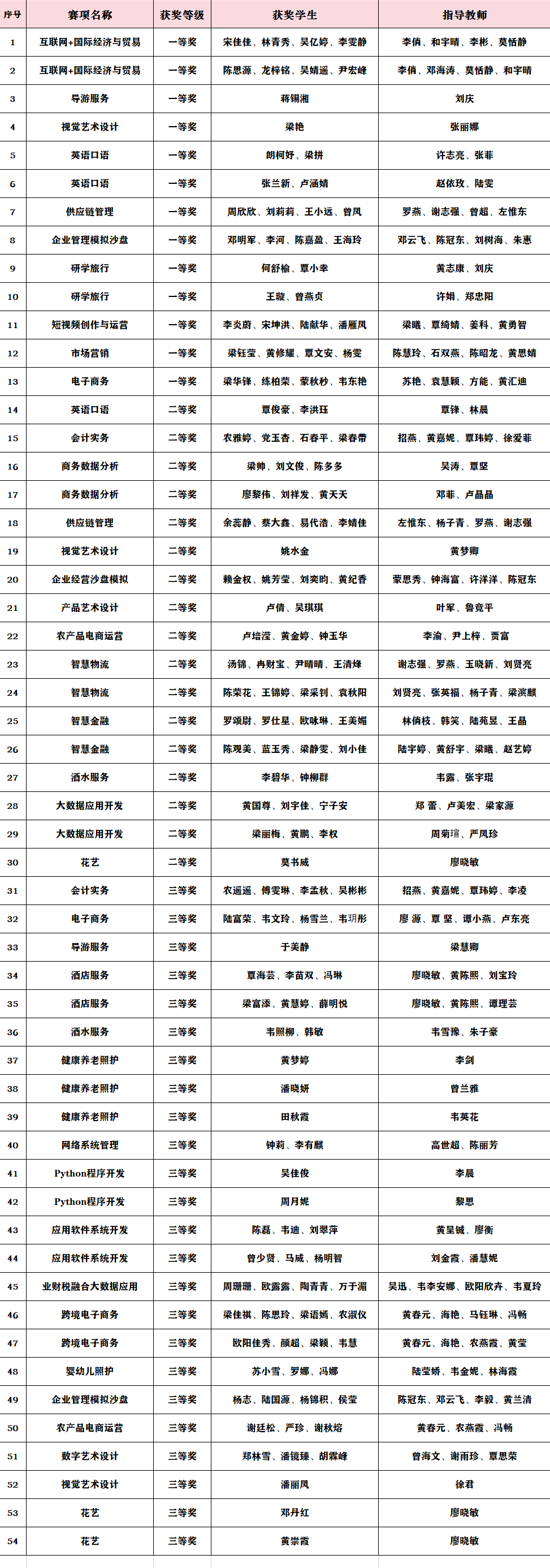 近日,由广西壮族自治区教育厅主办的2024年广西职业院校技能大赛圆满落幕。本次大赛学校共选派出151名选手参加33个赛项的角逐,根据自治区教育厅公示的拟获奖名单,我校获奖数量共54项,获奖人数140人,获奖率达到92.7%,获奖总数创历史新高。其中,一等奖13项,获奖数量与2023年持平;二等奖17项,比2023年增加7项,同比增长70%;三等奖24项,比2023年增加9项,同比增长60%;有望入围国赛5项,比2023年增加3项,同比增长150%。互联网+国际贸易、英语口语、研学旅行赛项各获一等奖2项,电子商务、短视频创作与运营、市场营销、供应链管理、企业管理模拟沙盘、导游服务赛项、视觉艺术设计赛项各获一等奖1项 。
