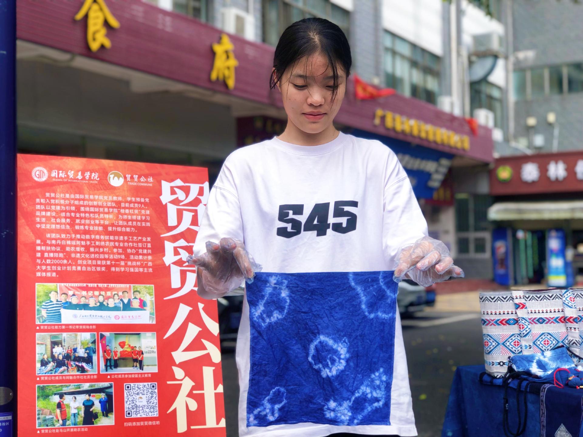 南丹县里湖瑶族乡怀里村白裤瑶非遗文化现场体验第一次走进校园。“白裤瑶制衣从种棉花、弹棉花、搓棉条到纺纱、刺绣、穿着,一共经过25道工序,具有白裤瑶特色的服饰最终呈现在大家面前。”阿魅合作社主理人为师生们详细介绍了白裤瑶的制衣工序,热情指导师生们沉浸式体验扎染。现场,国际贸易学院“贸贸公社”师生团队与阿魅合作社通过“线上直播+线下实体”相结合的方式,助力白裤瑶非遗文化产品的销售,为乡村振兴添砖加瓦。“听了大师的介绍,体验了扎染技艺,拉近了非遗文化与我们年轻人之间的距离,激发了我们对非遗文化的热爱,希望有机会能像学长学姐一样发挥自身专业优势,通过电商直播带货,推广白裤瑶非遗文化产品”,2024级电子商务9班谭晓雯同学说道。