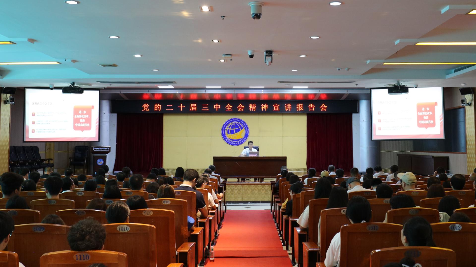 10月18日下午,我校举办党的二十届三中全会精神宣讲报告会,学校党委书记汪述斌作宣讲报告,学校党委副书记青增计主持报告会。全体校领导、中层干部、三层机构负责人和各基层党组织负责人,以及党员和师生代表共200余人参加报告会。