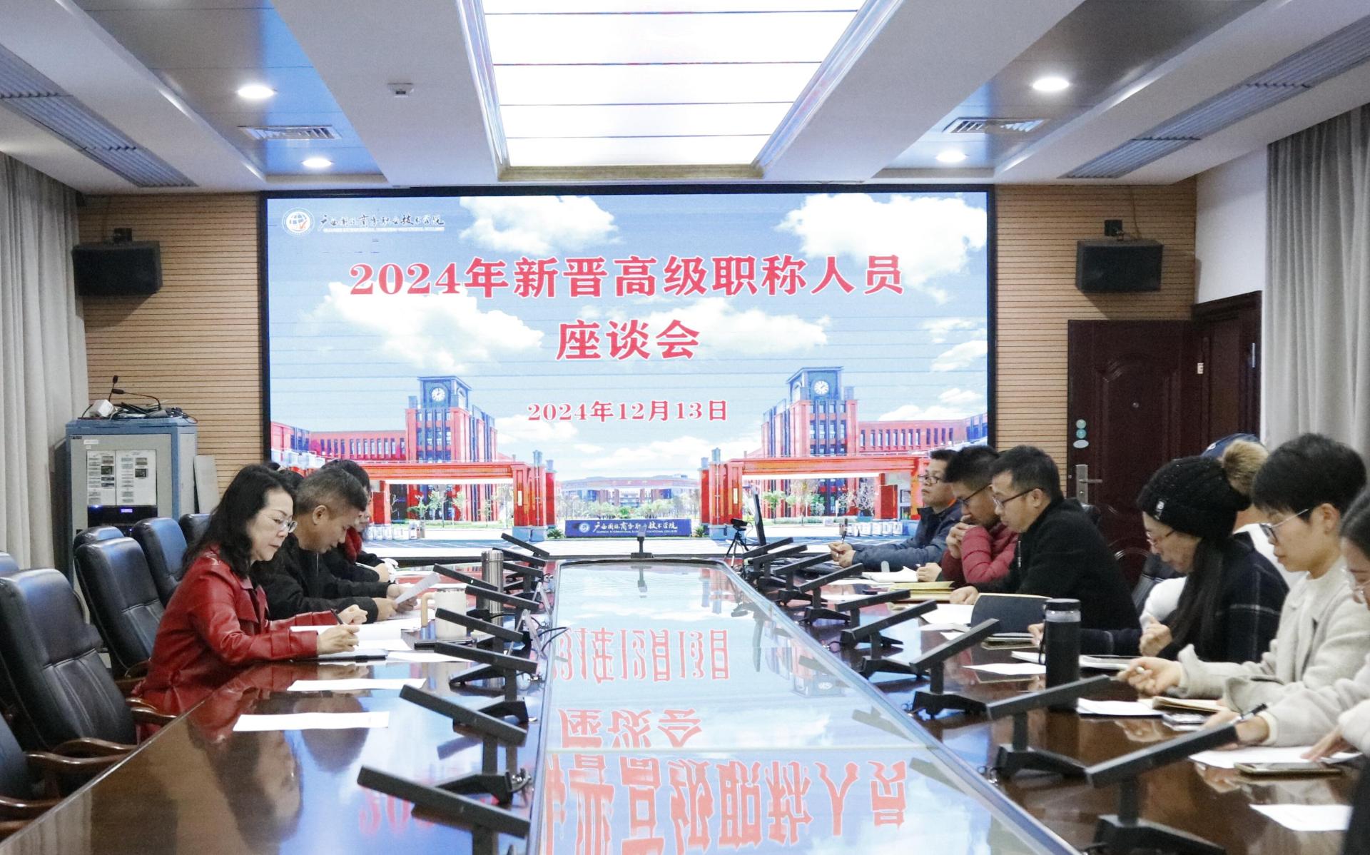 为深入学习贯彻党的二十大和二十届二中、三中全会精神,全面加强教师队伍建设,12月13日上午,我校召开2024年新晋高级职称人员座谈会。学校党委副书记、校长刘杰英出席,人事处负责人和2024年新晋高级职称的20多名教师参加座谈会。