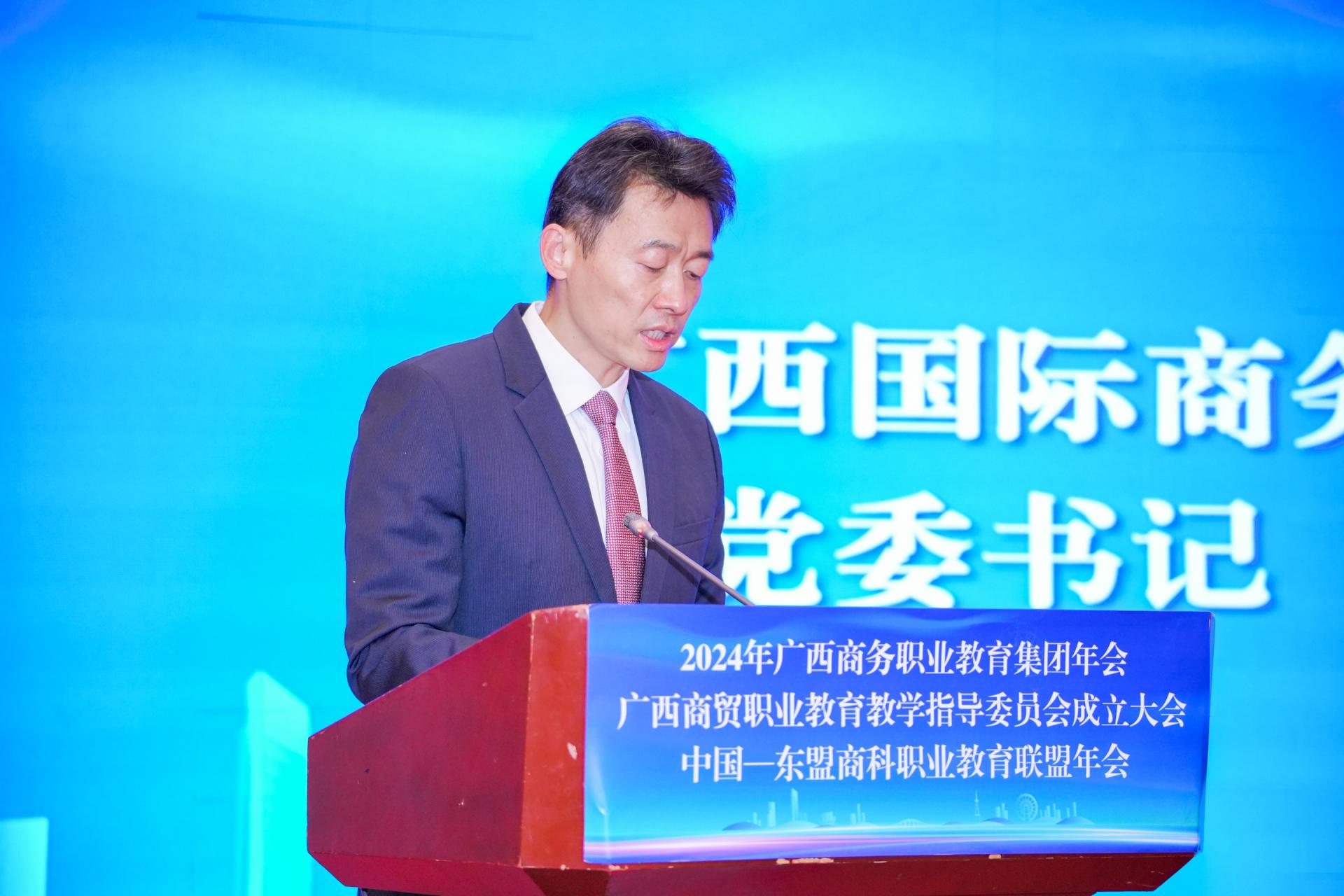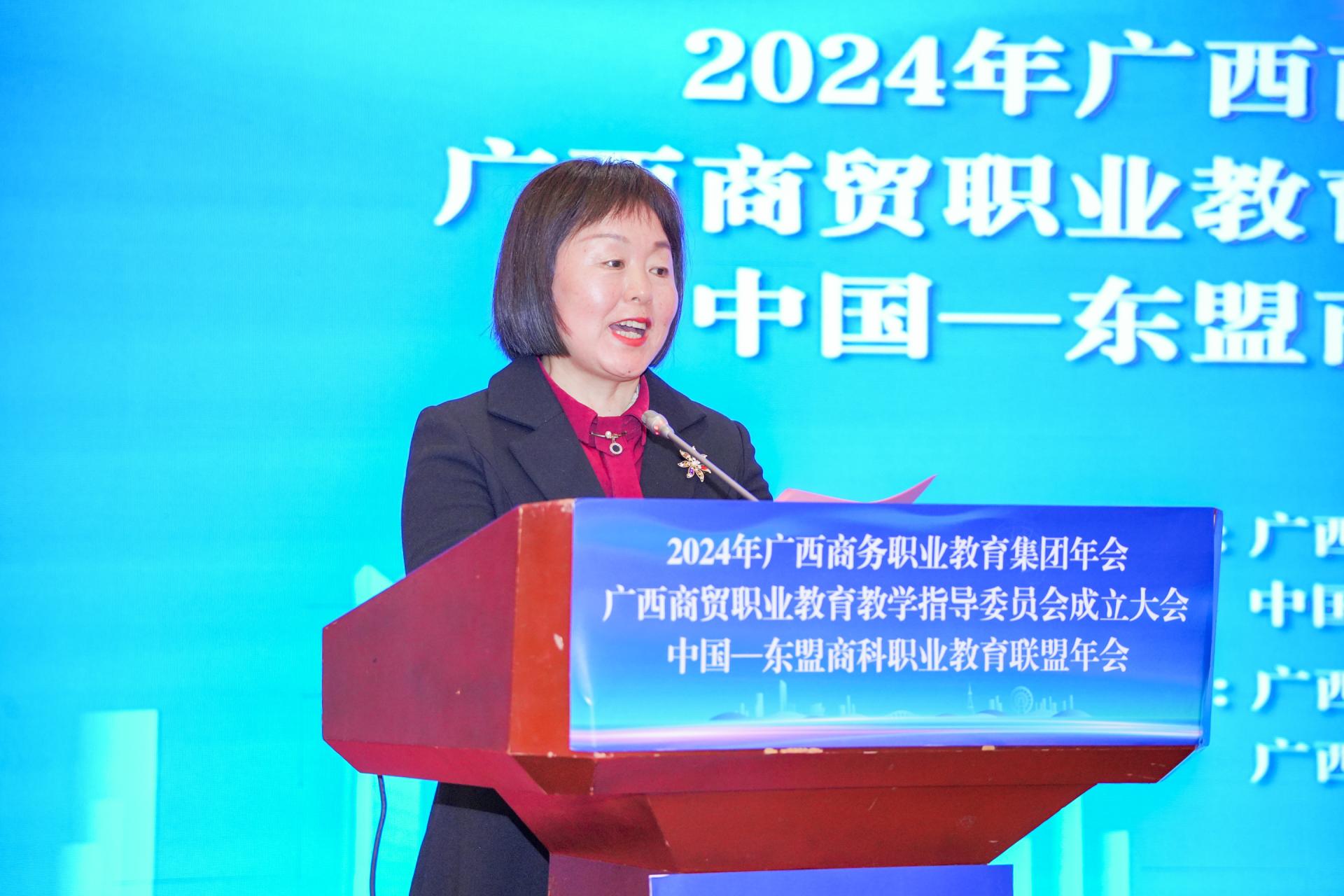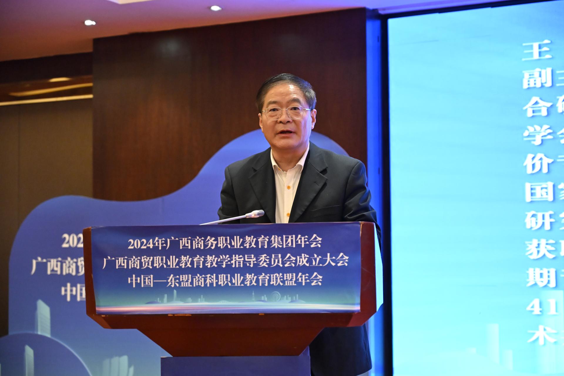 自治区商务厅副厅长粟坚则充分肯定广西商务职业教育集团、中国—东盟商科职业教育联盟在教育质量提升、人才培养模式创新、实训基地建设等方面取得的显著成效。他向职教集团、商科联盟和商贸教学指导委员会提出三点希望:一是围绕发展大局,培养高素质技能型人才;二是深化产教融合,推动校企合作取得新突破;三是加强交流合作,提升职业教育国际化水平。在围绕建设“一区两地一园一通道”,构建面向东盟的跨境产业链、供应链、价值链方面贡献力量。