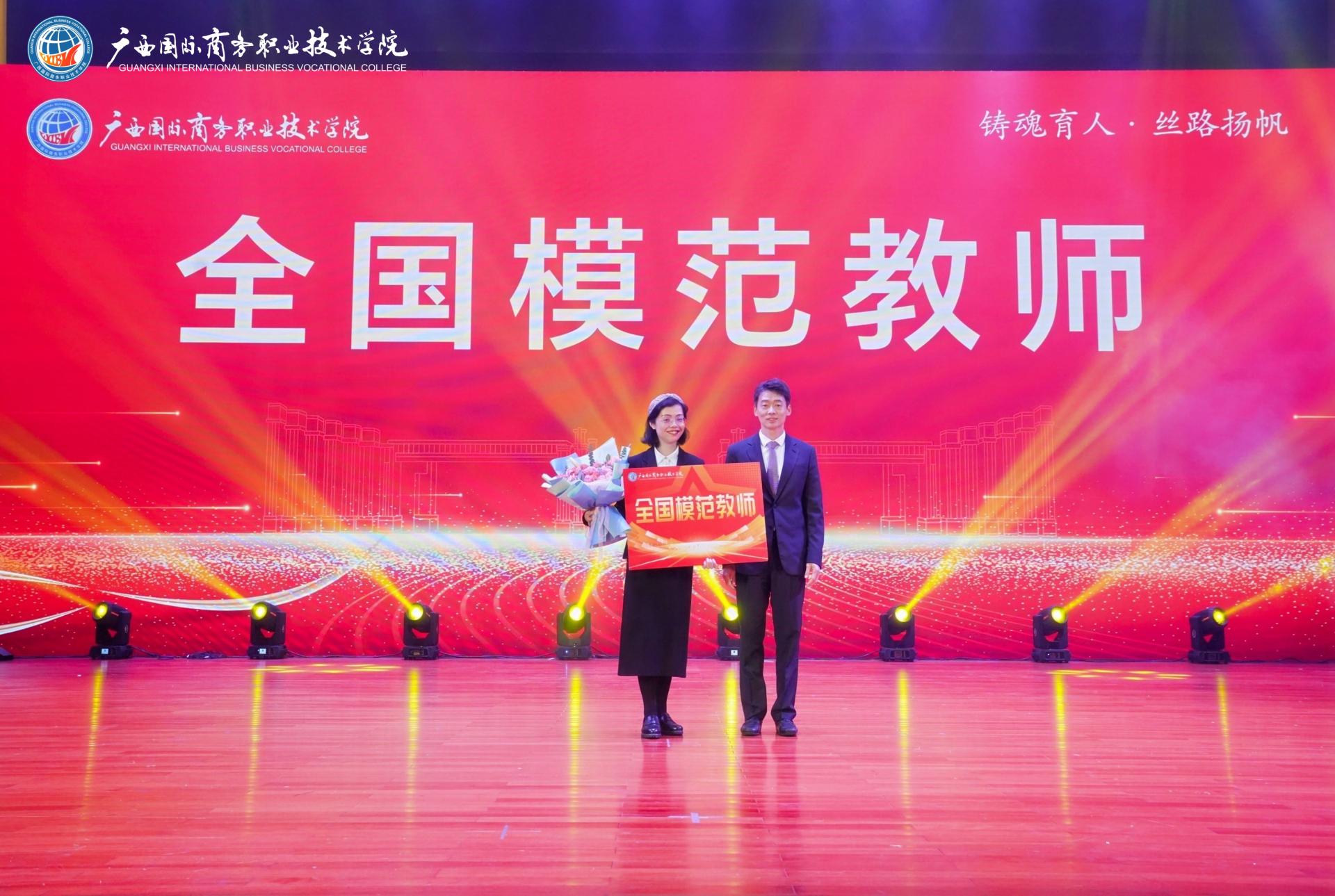 党委书记汪述斌为荣获“全国模范教师”荣誉的刘庆老师颁奖