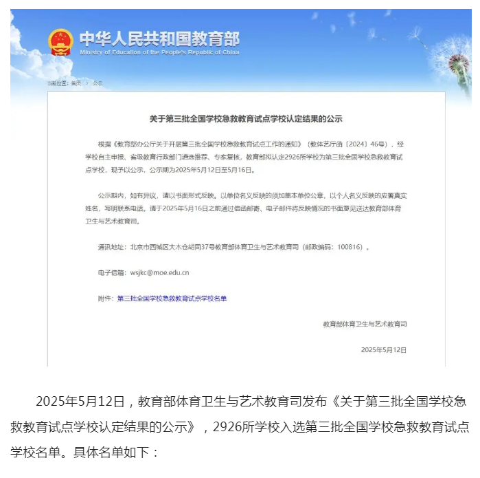 近日,根据教育部体育卫生与艺术教育司相关文件精神,经严格评审,我校凭借扎实的急救教育工作,成功入选第三批全国学校急救教育试点学校。这一荣誉的获得,不仅是对我校前期急救教育工作的肯定,也为持续推进急救教育工作提供了新的发展契机。