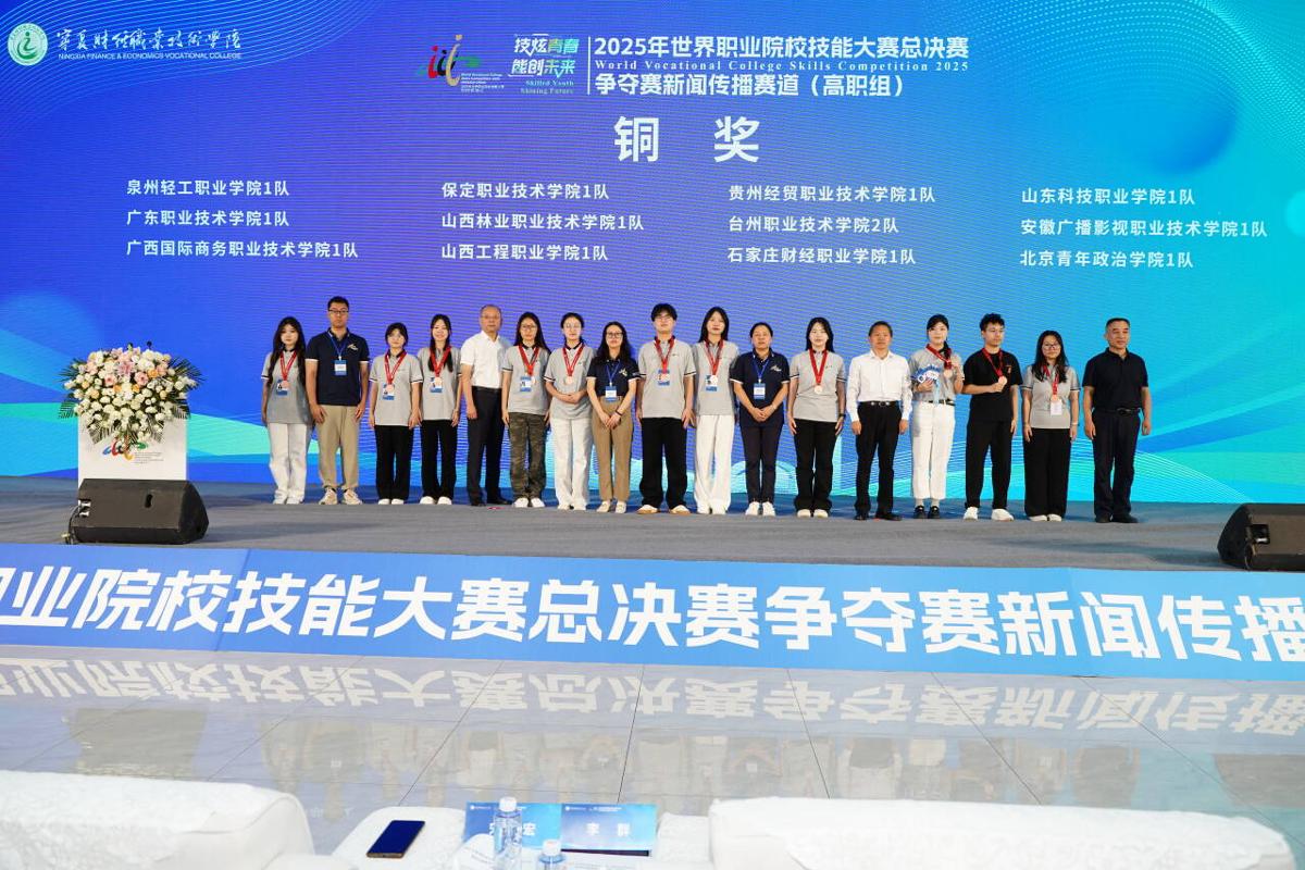 近日,在刚刚落幕的2025年世界职业院校技能大赛总决赛争夺赛新闻传播赛道(高职组)中,我校融媒体技术与运营专业学生秦文乐、蒋霄、陈可欣、钟晓雪代表参赛(指导老师:黄勇智、李毅)。参赛团队凭借扎实的专业功底、出色的创意能力和稳定的临场发挥,勇夺铜牌,为学校赢得了荣誉。这是我校深化产教融合、创新人才培养模式的成果缩影。