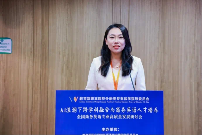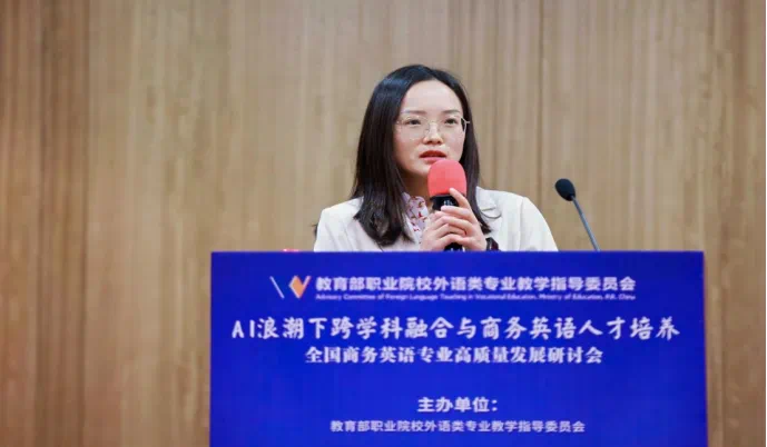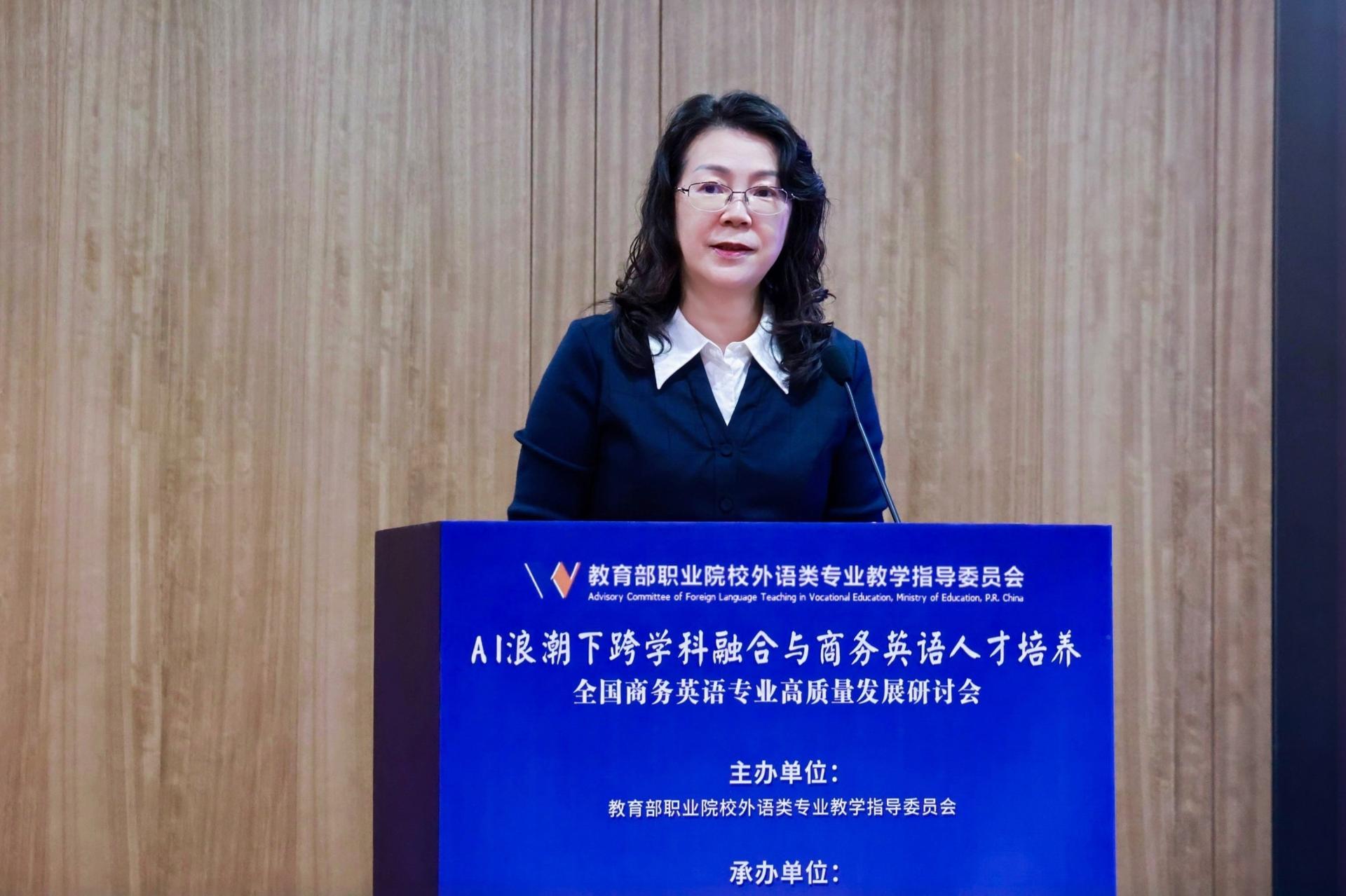 开幕式后,研讨会进入主旨解读与专题培训环节,为参会者带来兼具理论高度与实践价值的学术盛宴。在教学标准解读环节,教育部职业院校外语类专业教学指导委员会委员、商务英语专业指导委员会副主任委员、北京经济管理职业学院外语与学前教育学院党总支书记、院长王月会,围绕新版高等职业教育专科商务英语专业教学标准进行深度解析。她系统梳理了教学标准的核心框架、创新亮点与改革导向,结合商务翻译、跨境电商运营等岗位新要求,为一线教学实践提供了明确的行动指南,助力各院校精准把握专业建设方向。专题培训环节,北京外国语大学人工智能与人类语言重点实验室教授、外语健脑强智中心主任刘红艳以“智能化时代呼唤——职业外语教育语言服务新模态”为主题展开分享。她深入剖析了AI技术在商务英语教学核心环节的应用场景,展示了智能工具如何破解传统教学痛点,并为教师运用AI技术提升教学质量提供了科学的数据支撑与实操方法,让在场同仁深受启发。