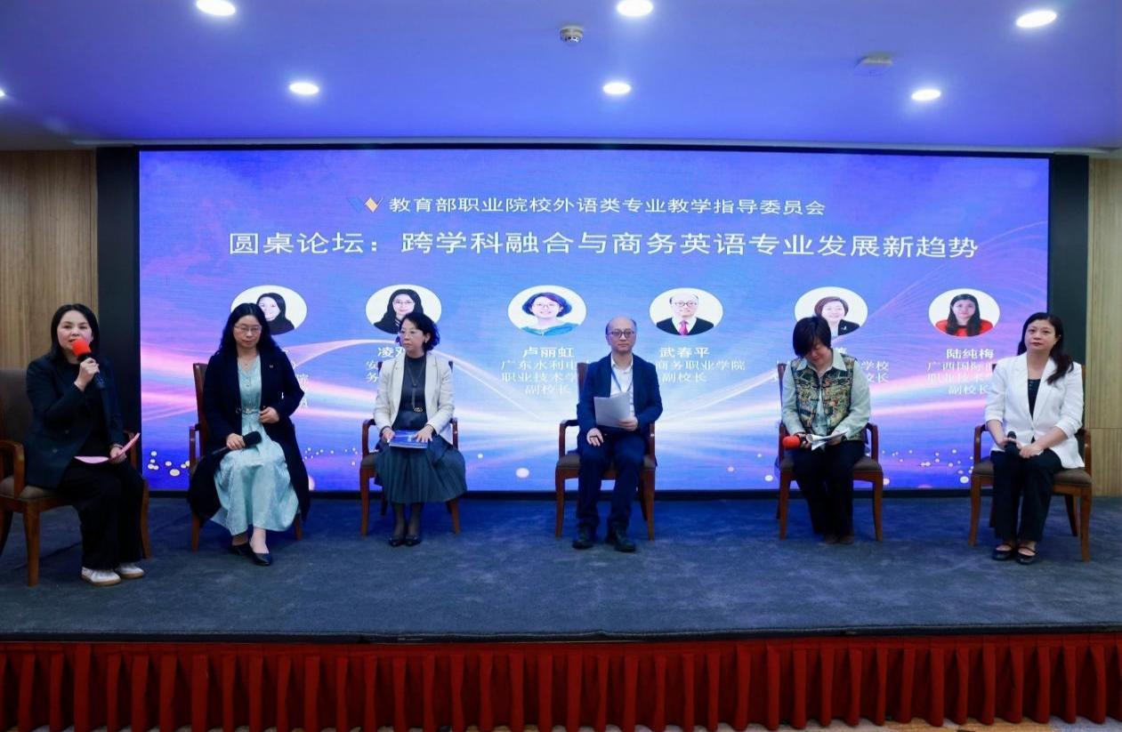 圆桌论坛以“跨学科融合与商务英语专业发展新趋势”为主题,邀请安徽国际商务职业学院副校长凌双英、广东水利电力职业技术学院副校长卢丽虹、天津商务职业学院副校长武春平、上海商业会计学校校长杨菁、我校副校长陆纯梅五位专家展开深度对话。五位嘉宾围绕人才培养适配性、校企协同育人、跨学科融合路径、师资队伍建设等核心议题,分享了各自院校的实践经验,提出了重塑师资结构、完善场景化评价机制等务实方案,为专业升级提供了多元思路。论坛由教育部职业院校外语类专业教学指导委员会委员、商务英语专业指导委员会副主任委员、北京经济管理职业学院外语与学前教育学院党总支书记、院长王月会教授主持。