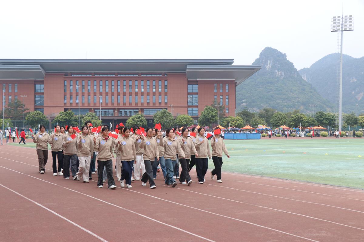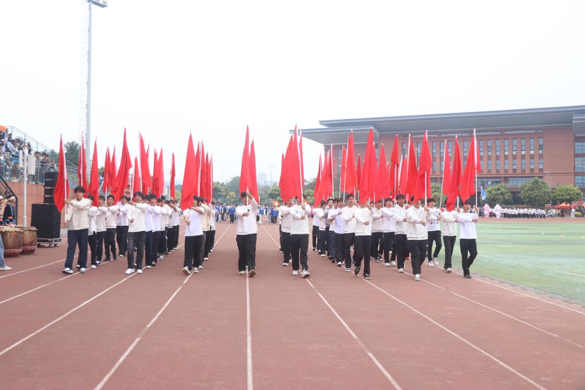 上午9时,开幕式正式拉开帷幕。伴随着激昂的《运动员进行曲》,国旗护卫队迈着铿锵有力的步伐率先入场,鲜艳的五星红旗迎风招展,熠熠生辉。随后,国旗队、校旗队、红旗队及裁判员代表队、各二级学院代表队、教职工代表队依次有序入场,他们或身着特色服饰,或手持创意道具,展现着各自的风采与活力,赢得了现场观众雷鸣般的掌声与喝彩。