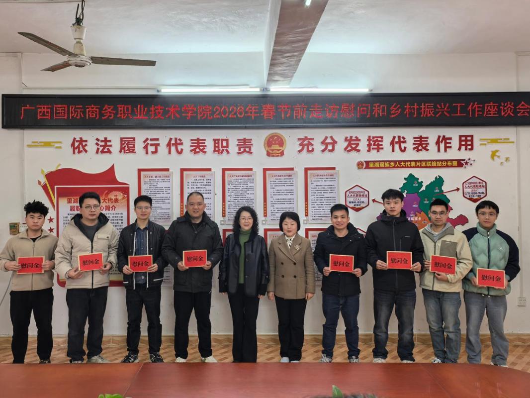 刘杰英表示,学校选派驻村干部的成长有赖于县、乡党委政府的关心、照顾和培养,在“十五五”开局之年,校地双方应持续加强双向合作,共建互助。学校将充分发挥职教特色专业优势,用好乡村振兴学院培育平台,继续深化非遗文旅项目、村集体经济项目、农村金融领域项目、干部能力培训项目等合作,驻村工作队要积极发扬党建引领精神,与村“两委”共同为群众排忧解难,持续促进各帮扶村产业发展和消费帮扶,助推乡村振兴各项工作成效全面提升。会后,刘杰英代表学校党委对7名驻村工作队员进行春节前慰问,并前往甲木村、怀里村和瑶里村走访慰问帮扶对象代表。