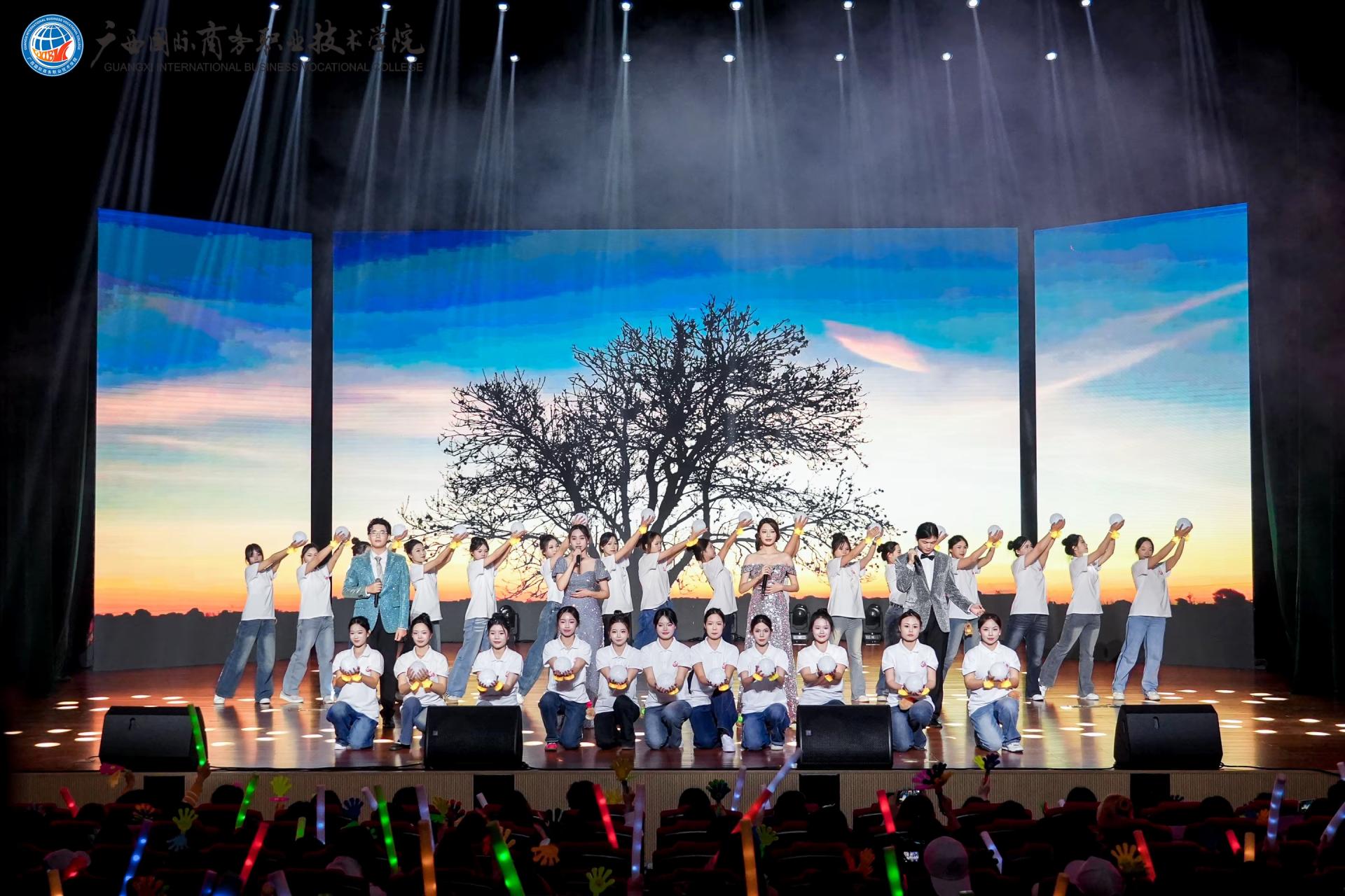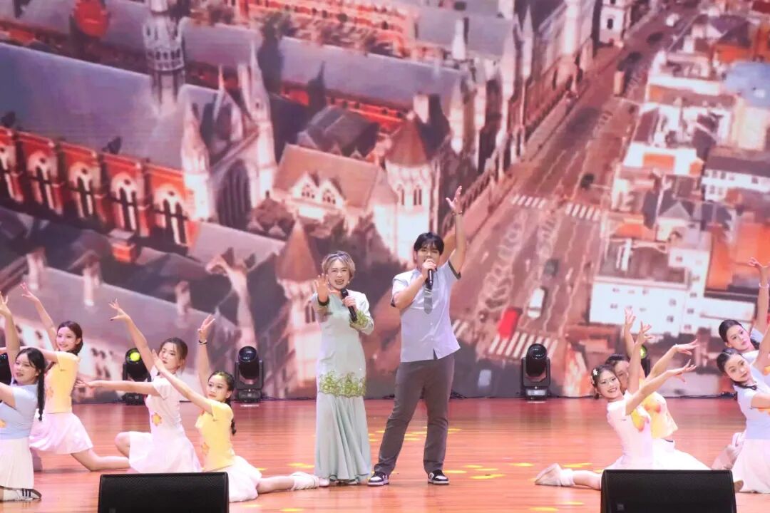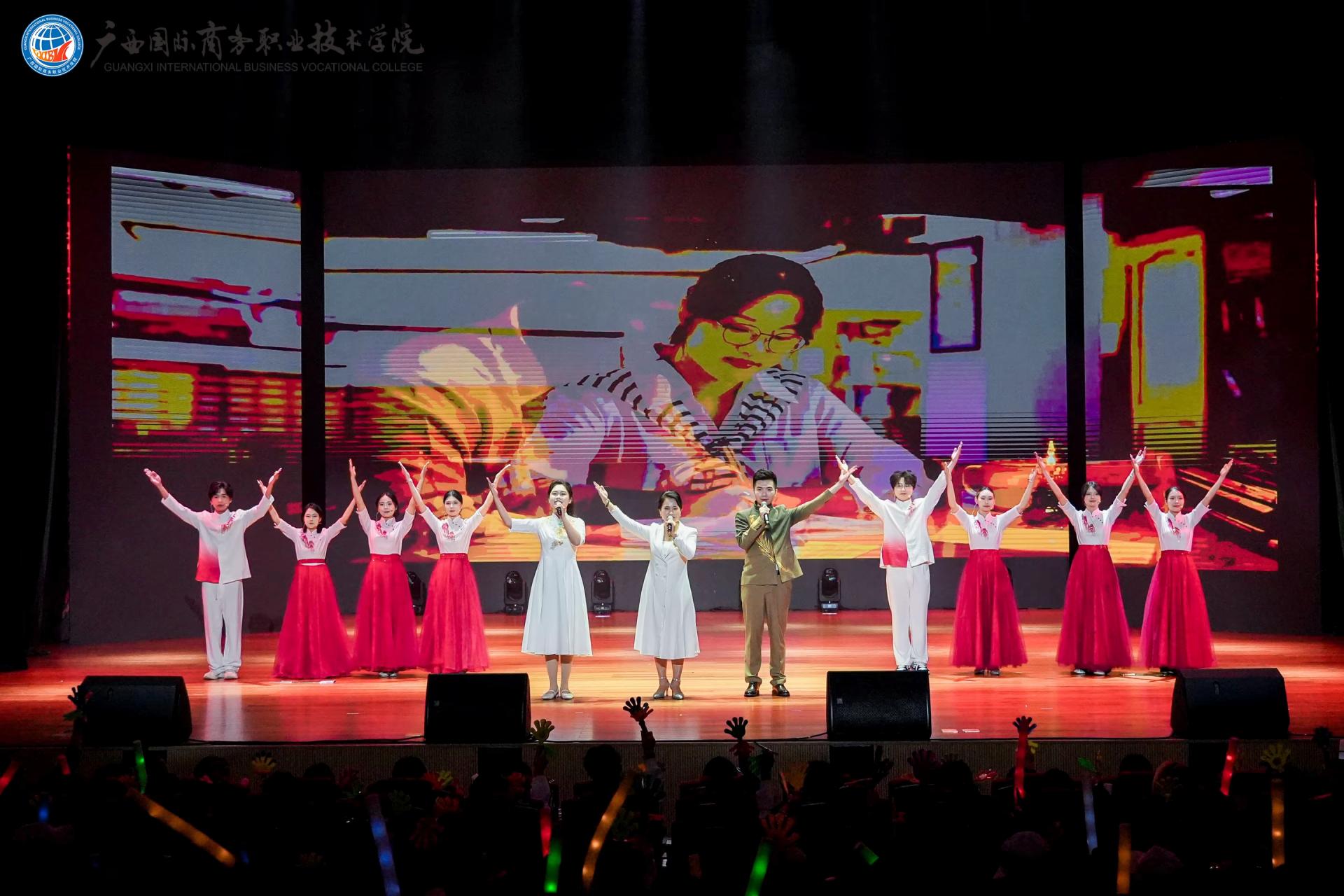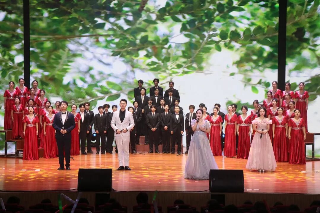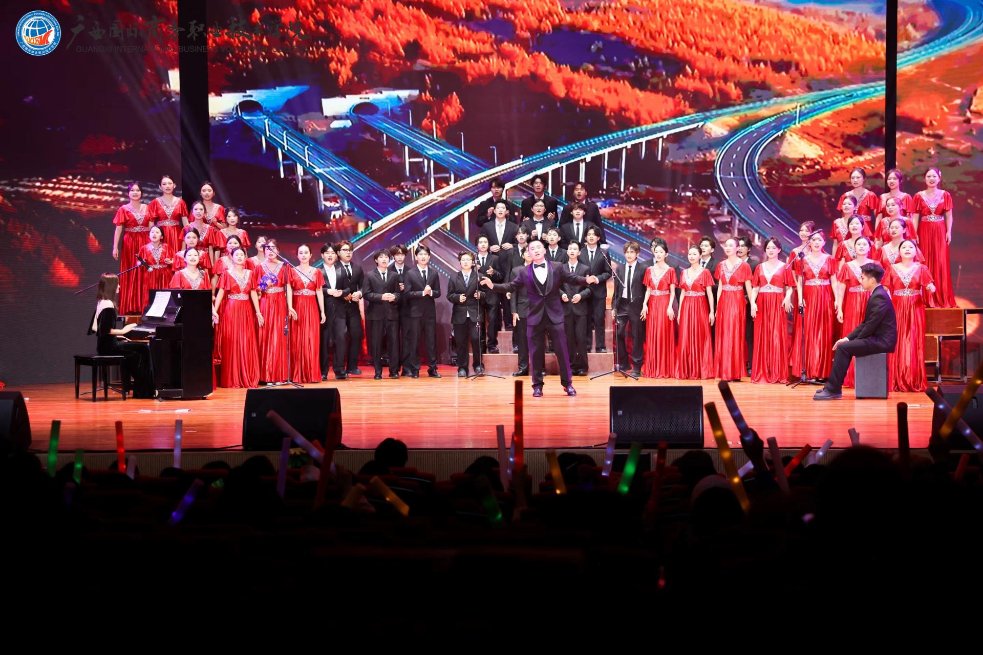 下篇《商通天下‧丝路扬帆》放眼国际化办学格局,舞蹈《锦绣情》,师生以灵动舞姿演绎跨越山海的深情厚谊,展现了学校与海外院校合作交流的丰硕成果与对未来的美好憧憬。歌舞《桂海情》则通过师生同台献艺,融合多语种演唱与跨文化舞蹈,生动呈现了学校在外语教学、国际交流领域的创新实践。此外,合唱《我爱你中国》以磅礴气势激荡爱国情怀,原创歌曲《山海同唱》以悠扬旋律共贺华诞,将展演推向高潮,展现了师生胸怀家国、放眼世界的格局与担当。