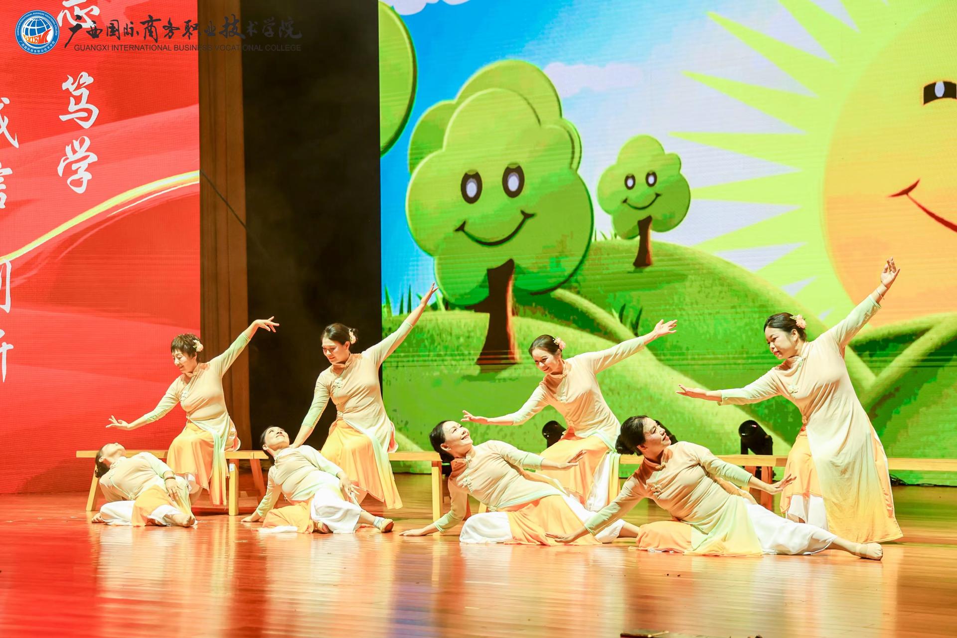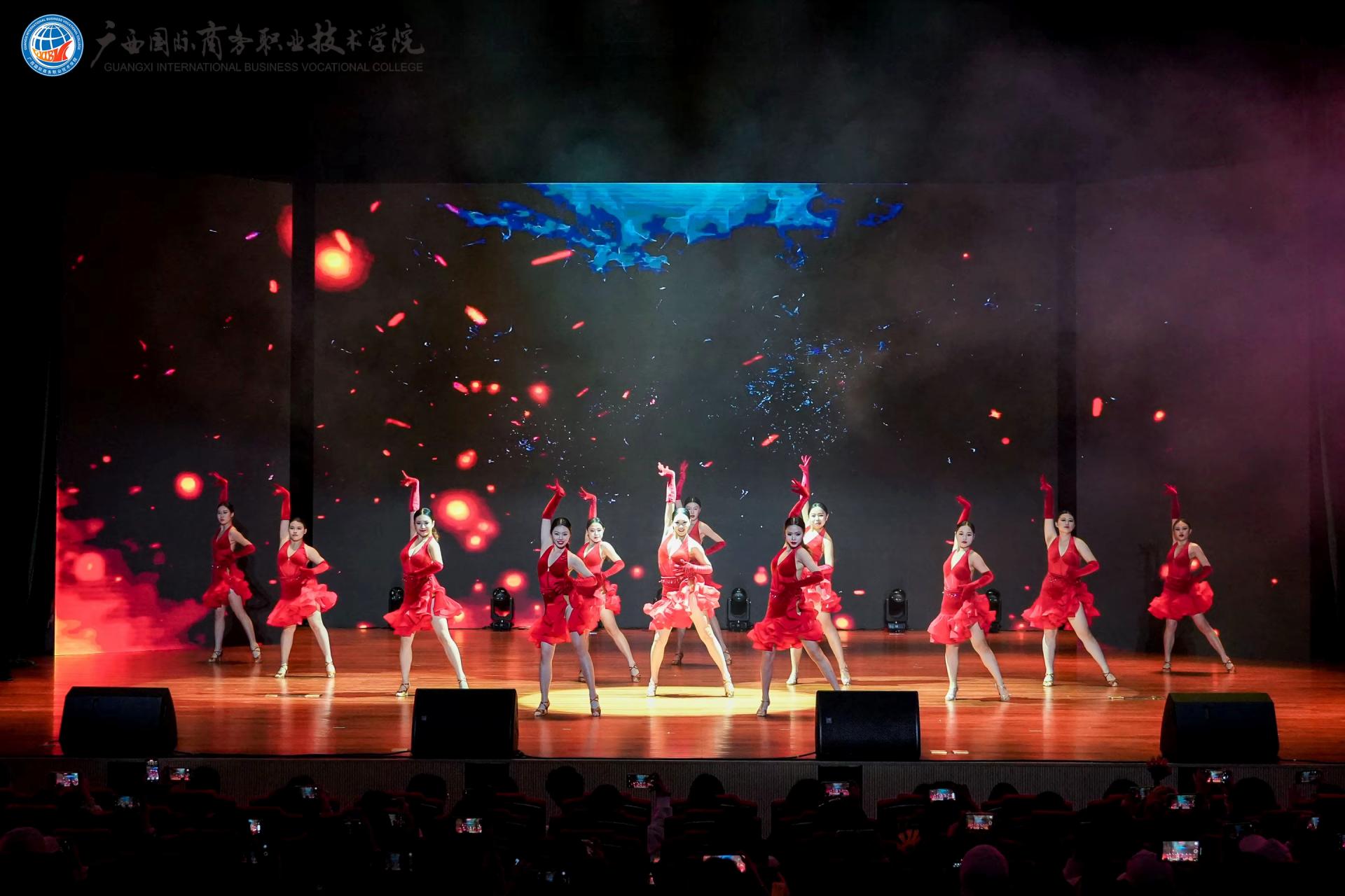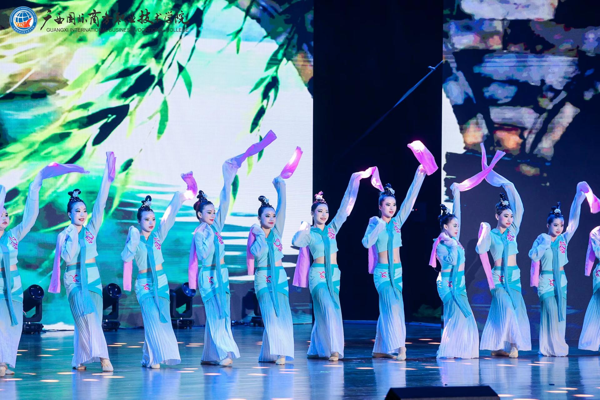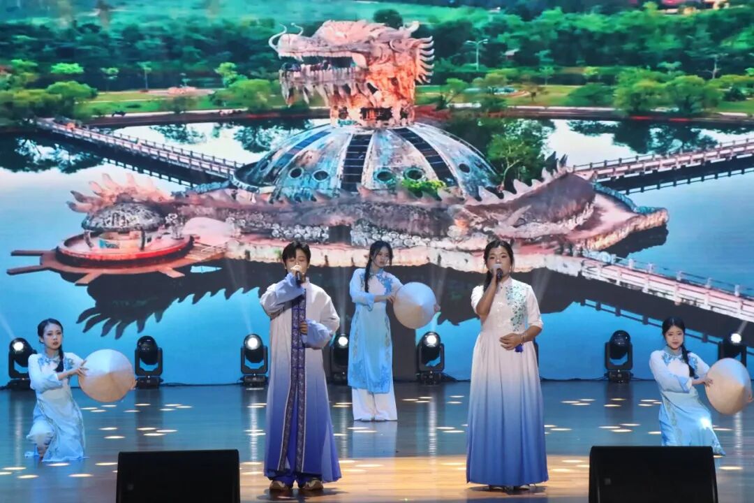 下篇《商通天下‧丝路扬帆》放眼国际化办学格局,舞蹈《锦绣情》,师生以灵动舞姿演绎跨越山海的深情厚谊,展现了学校与海外院校合作交流的丰硕成果与对未来的美好憧憬。歌舞《桂海情》则通过师生同台献艺,融合多语种演唱与跨文化舞蹈,生动呈现了学校在外语教学、国际交流领域的创新实践。此外,合唱《我爱你中国》以磅礴气势激荡爱国情怀,原创歌曲《山海同唱》以悠扬旋律共贺华诞,将展演推向高潮,展现了师生胸怀家国、放眼世界的格局与担当。