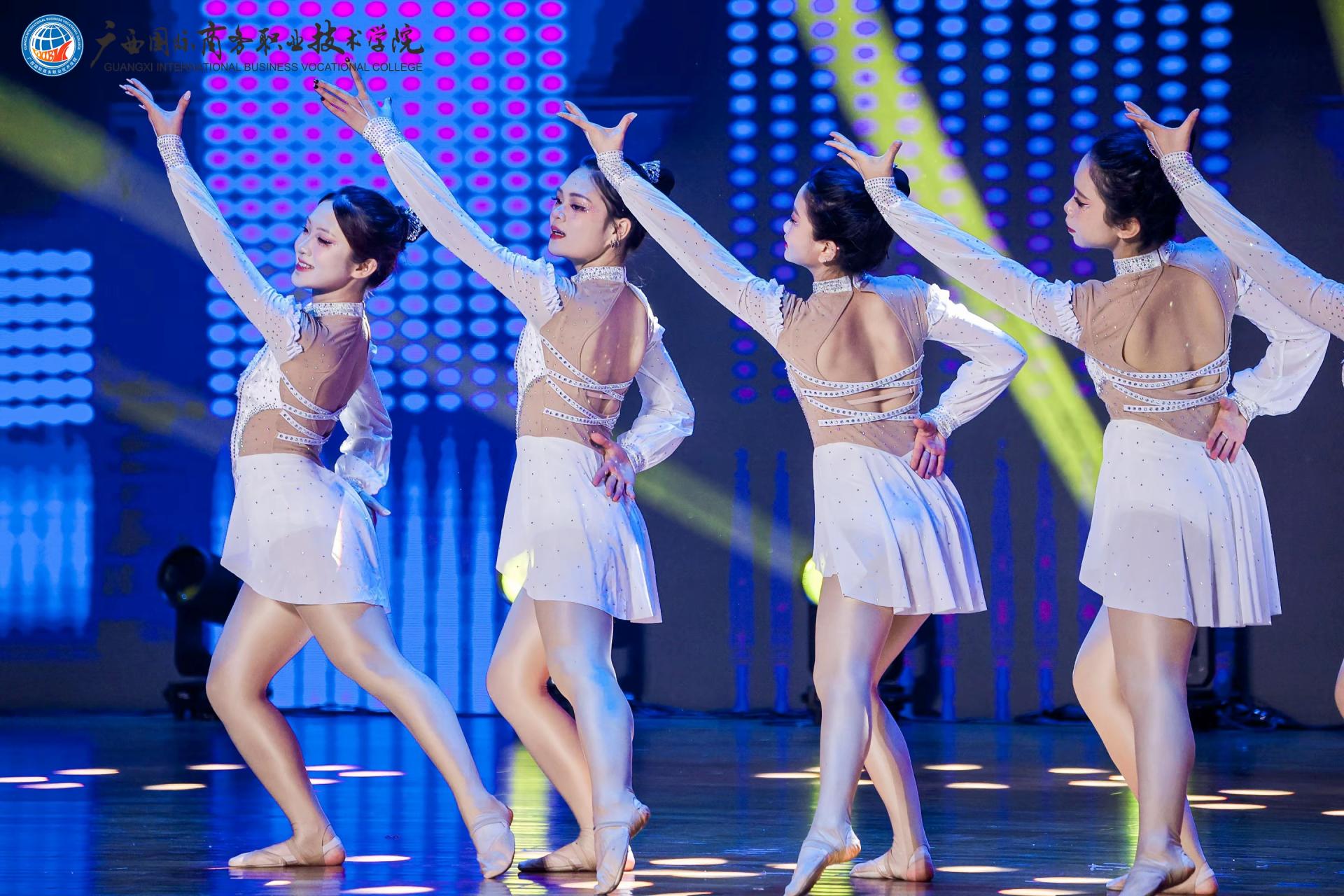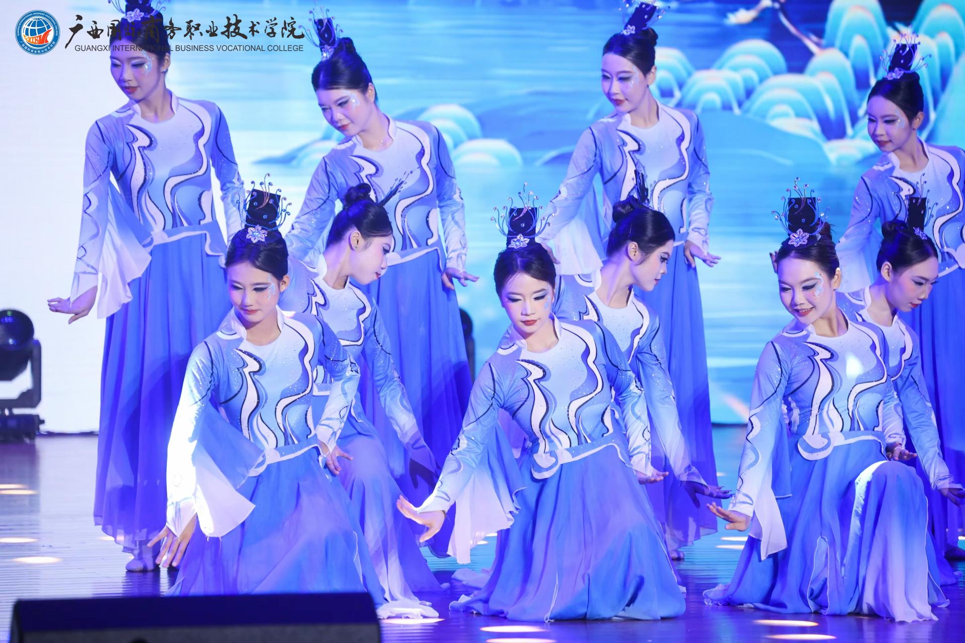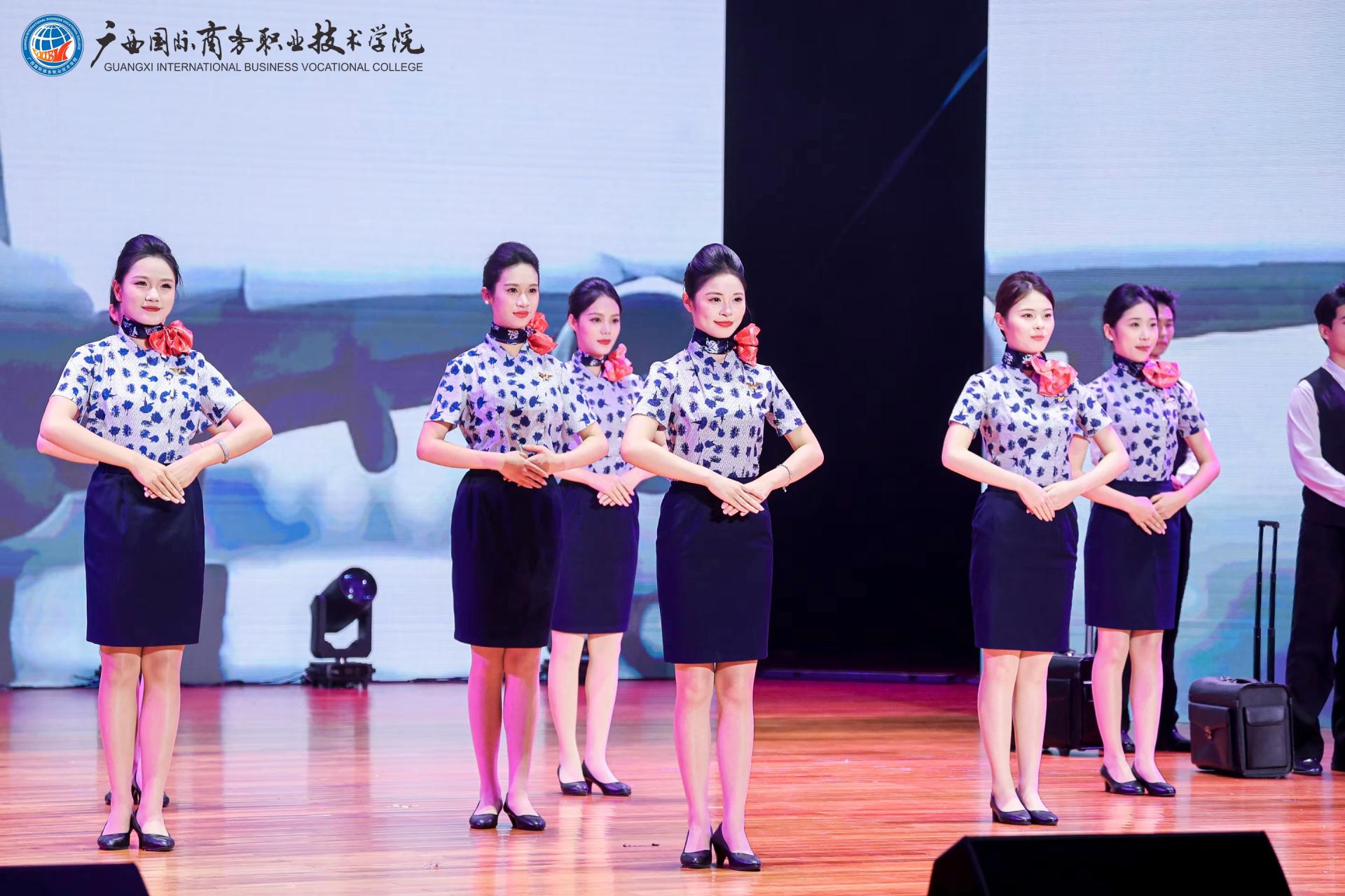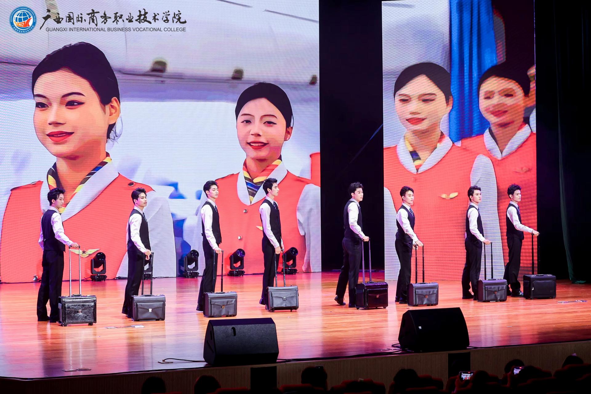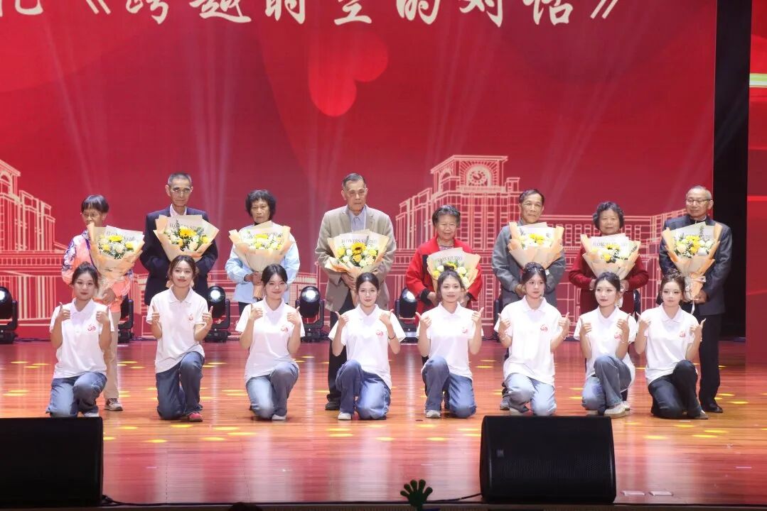 中篇《商聚八桂‧华章正盛》立足广西地域特色,以多元艺术形式诠释商科教育与八桂文化的深度融合。情景剧《桂子飘香》生动演绎学子从青涩到卓越的成长蜕变,彰显办学质量提升与产教融合成果。街舞《炫舞青春》以创新编排释放年轻一代的创造力。航空礼仪操《乘梦而行‧礼赞青春》通过标准化仪态与场景化演绎,精准展现航空服务等特色专业的职业素养与行业风范。舞蹈《象山水月‧采薇情长》以山水意象与民族风情,诠释广西商贸与文化的共生共荣。此外,北海校友代表倾情献演舞蹈《强国有我》,以刚劲有力的舞姿抒发热血赤忱,奏响新时代商科人的强国强音。最令人动容的《跨越时空的对话》环节,1965级校友代表踏上舞台,2025级新生代表手捧鲜花庄重献礼。掌声雷动间,既致敬前辈的奉献,亦期许青年接续奋斗,以青春传承商道薪火。