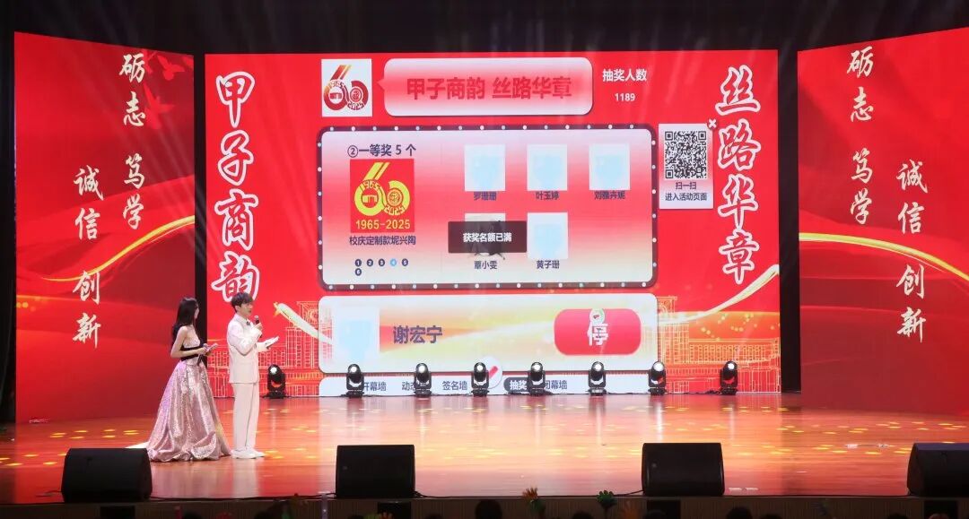 同时,晚会还设置了抽奖环节,通过线上互动形式,观众扫码参与赢取建校60周年精美奖品。此举不仅增添了趣味性,更将现场气氛推向高潮,成为连接师生校友、回馈支持者的暖心亮点。