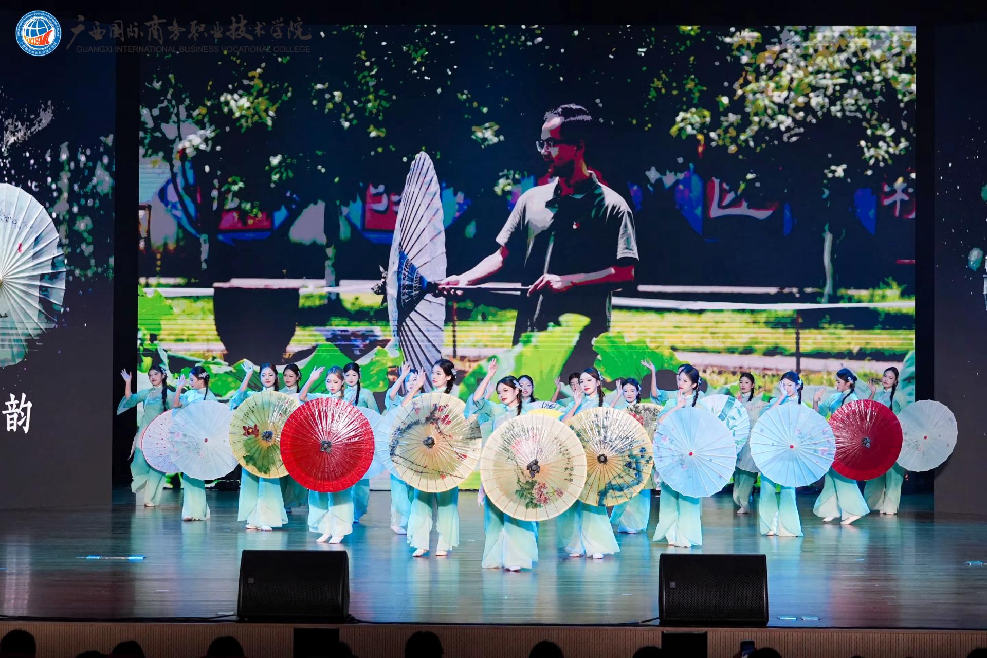 上篇《商脉溯源‧梦想启航》聚焦学校发展根基,以朗诵《六秩华章,商韵流芳》深情回溯建校六十年的风雨征程与商科育人传承。退休教职工代表以自编舞蹈《亲爱的你啊》登台,用舞步诉说对学校深情的眷恋与真挚的祝福。随后,歌舞《向光而行》以激昂的旋律与灵动的舞姿,生动诠释学子追逐梦想、向光而行的昂扬姿态。古典舞《伞韵》则令人惊艳——舞者手持油纸伞翩然起舞,不仅展现了艺术之美,更通过匠心独运的编排,彰显我校产教融合、校企协同、实践育人取得的丰硕成果。