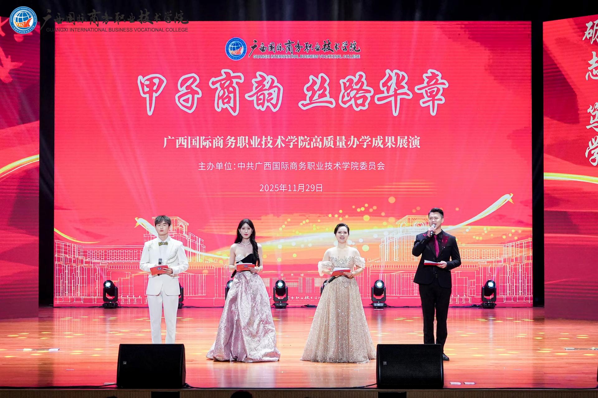2025年11月29日晚,我校在东盟校区聚学堂成功举办“甲子商韵·丝路华章”高质量办学成果展演。同时,东盟校区足球场、大学路校区东盟广场设置分会场现场直播,学校视频号、抖音号线上直播,让全校师生、海内外校友及社会各界人士共同见证这一璀璨时刻。350余名师生校友倾情参演,奏响了一曲“产教融合、开放共赢”的时代交响。