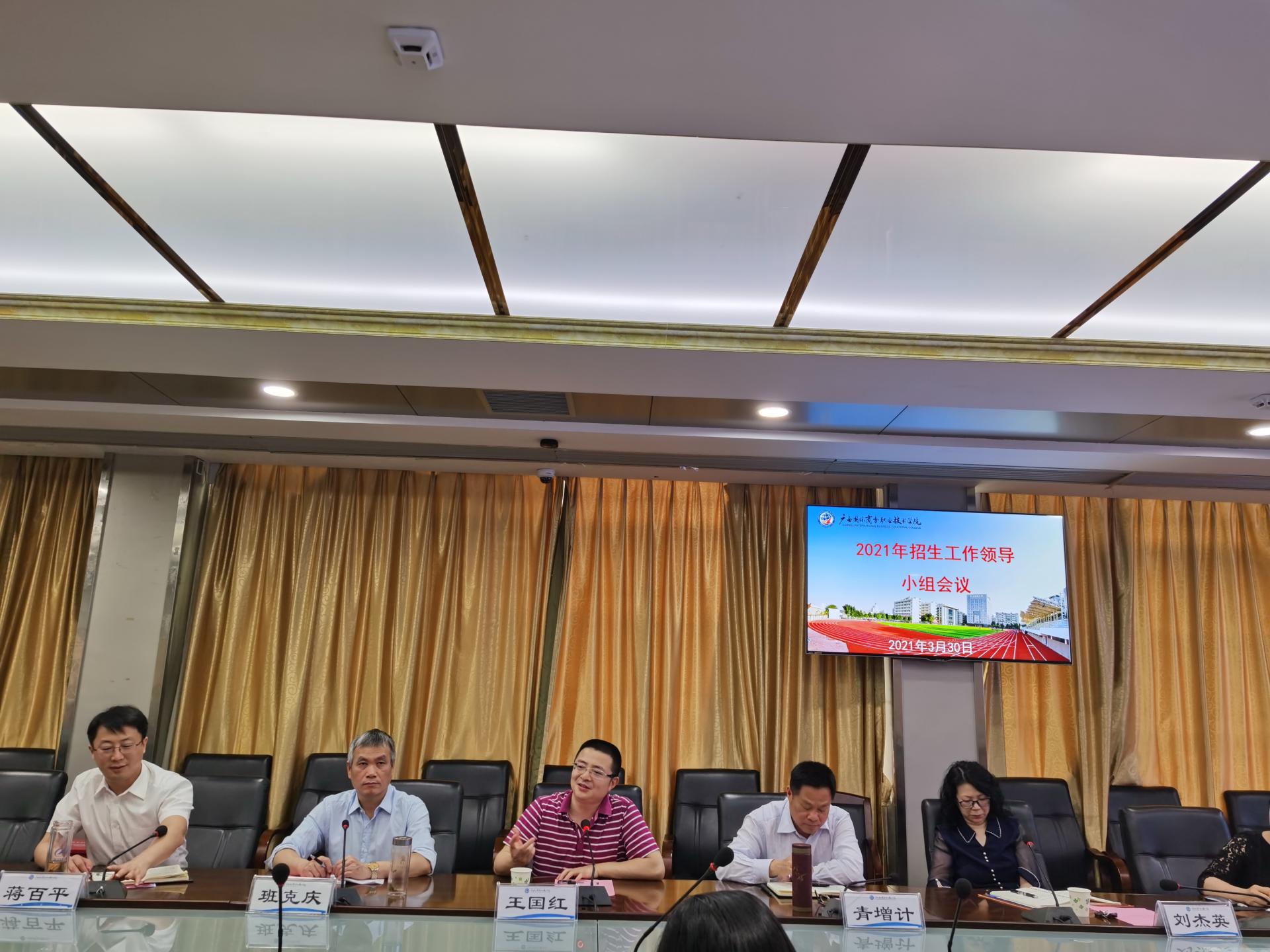 2021年,国际疫情继续蔓延,疫情形势依然严峻,国内疫情防控工作常规化、常态化,大型高招会、宣讲会等常规招生宣传途径依然受到不同程度的影响;今年学院启用新校区,招生规模将继续扩大,招生计划10000人,达历史之最,全面做好2021年招生工作迫在眉睫。为进一步统筹做好2021年各项招生工作,3月30日上午,我院在2栋一楼会议室召开2021年招生工作领导小组会议。学院院长王国红、党委副书记青增计、副院长班克庆、副院长刘杰英、副院长蒋百平出席会议,学院2021年招生工作领导小组成员参加会议,会议由副院长蒋百平主持。