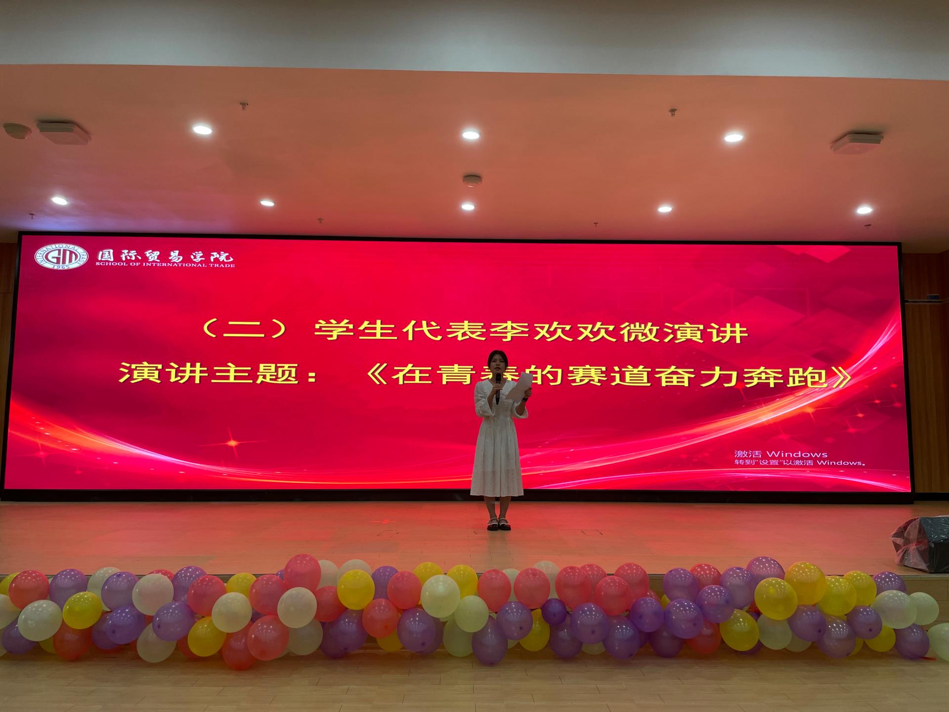 表彰大会共分为“问学”“通达”“致远”三个篇章。分别表彰了各级各类技能大赛、奖学金、创业比赛、团学活动等集体和个人奖项,获奖代表李欢欢、朱双燕从学习和学生干部角度发表了微演讲,分享了自己在国际贸易学院的奋斗青春、寻梦之旅,带着“长风破浪会有时,直挂云帆济沧海”的信念,志存高远、勇立潮头,努力做时代的“领航人”。